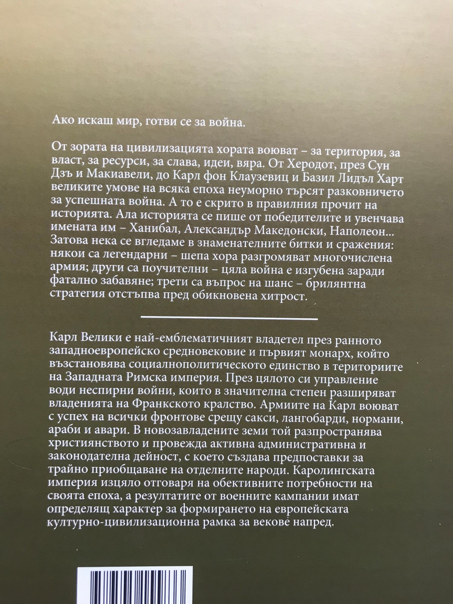 Ако искаш мир, готви се за война. От зората на цивилизацията хората воюват - за територия, за власт, за ресурси, за слава, идеи, вяра. От Херодот, през Сун Дзъ и Макиавели, до Карл фон Клаузевиц и Базил Лидъл Харт великите умове на всяка епоха неуморно търсят разковничето за успешната война. А то е скрито в правилния прочит на историята. Ала историята се пише от победителите и увенчава имената им - Ханибал, Александър Македонски, Наполеон... Затова нека се вгледаме в знаменателните битки и сражения: някои са легендарни - шепа хора разгромяват многочислена армия; други са поучителни - цяла война е изгубена заради фатално забавяне; трети са въпрос на шанс - брилянтна стратегия отстъпва пред обикновена хитрост. Карл Велики е най-емблематичният владетел през ранното западноевропейско средновековие и първият монарх, който възстановява социалнополитическото единство в териториите на Западната Римска империя. През цялото си управление води неспирни войни, които в значителна степен разширяват владенията на Франкското кралство. Армиите на Карл воюват с успех на всички фронтове срещу сакси, лангобарди, нормани, араби и авари. В новозавладените земи той разпространява християнството и провежда активна административна и законодателна дейност, с което създава предпоставки за трайно приобщаване на отделните народи. Каролингската империя изцяло отговаря на обективните потребности на своята епоха, а резултатите от военните кампании имат определящ характер за формирането на европейската културно-цивилизационна рамка за векове напред.