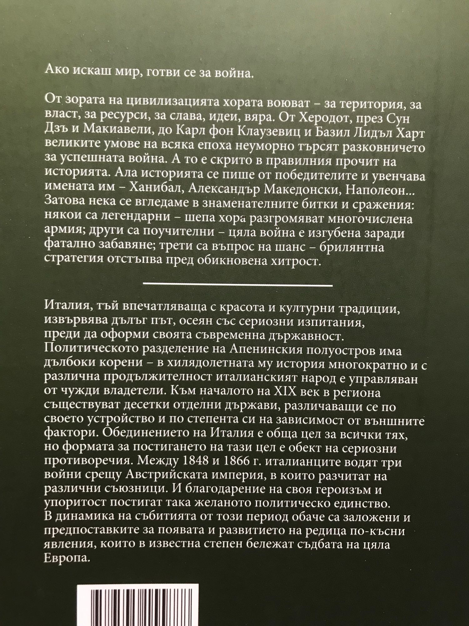 Ако искаш мир, готви се за война. Книга двадесета от поредицата „История на войните“. Италия, тъй впечатляваща с красота и културни традиции, извървява дълъг път, осеян със сериозни изпитания, преди да оформи своята съвременна държавност. От зората на цивилизацията хората воюват - за територия, за власт, за ресурси, за слава, идеи, вяра. От Херодот, през Сун Дзъ и Макиавели, до Карл фон Клаузевиц и Базил Лидъл Харт великите умове на всяка епоха неуморно търсят разковничето за успешната война. А то е скрито в правилния прочит на историята. Ала историята се пише от победителите и увенчава имената им - Ханибал, Александър Македонски, Наполеон... Затова нека се вгледаме в знаменателните битки и сражения: някои са легендарни - шепа хора разгромяват многочислена армия; други са поучителни - цяла война е изгубена заради фатално забавяне; трети са въпрос на шанс - брилянтна стратегия отстъпва пред обикновена хитрост. Италия, тъй впечатляваща с красота и културни традиции, извървява дълъг път, осеян със сериозни изпитания, преди да оформи своята съвременна държавност. Политическото разделение на Апенинския полуостров има дълбоки корени – в хилядолетната му история многократно и с различна продължителност италианският народ е управляван от чужди владетели. Към началото на XIX век в региона съществуват десетки отделни държави, различаващи се по своето устройство и по степента си на зависимост от външните фактори. Обединението на Италия е обща цел за всички тях, но формата за постигането на тази цел е обект на сериозни противоречия. Между 1848 и 1866 г. италианците водят три войни срещу Австрийската империя, в които разчитат на различни съюзници. И благодарение на своя героизъм и упоритост постигат така желаното политическо единство. В динамика на събитията от този период обаче са заложени и предпоставките за появата и развитието на редица по-късни явления, които в известна степен бележат съдбата на цяла Европа.