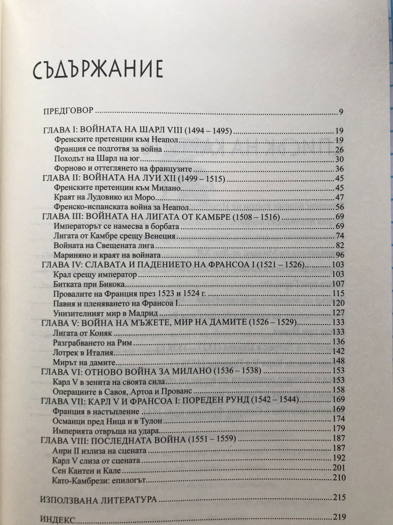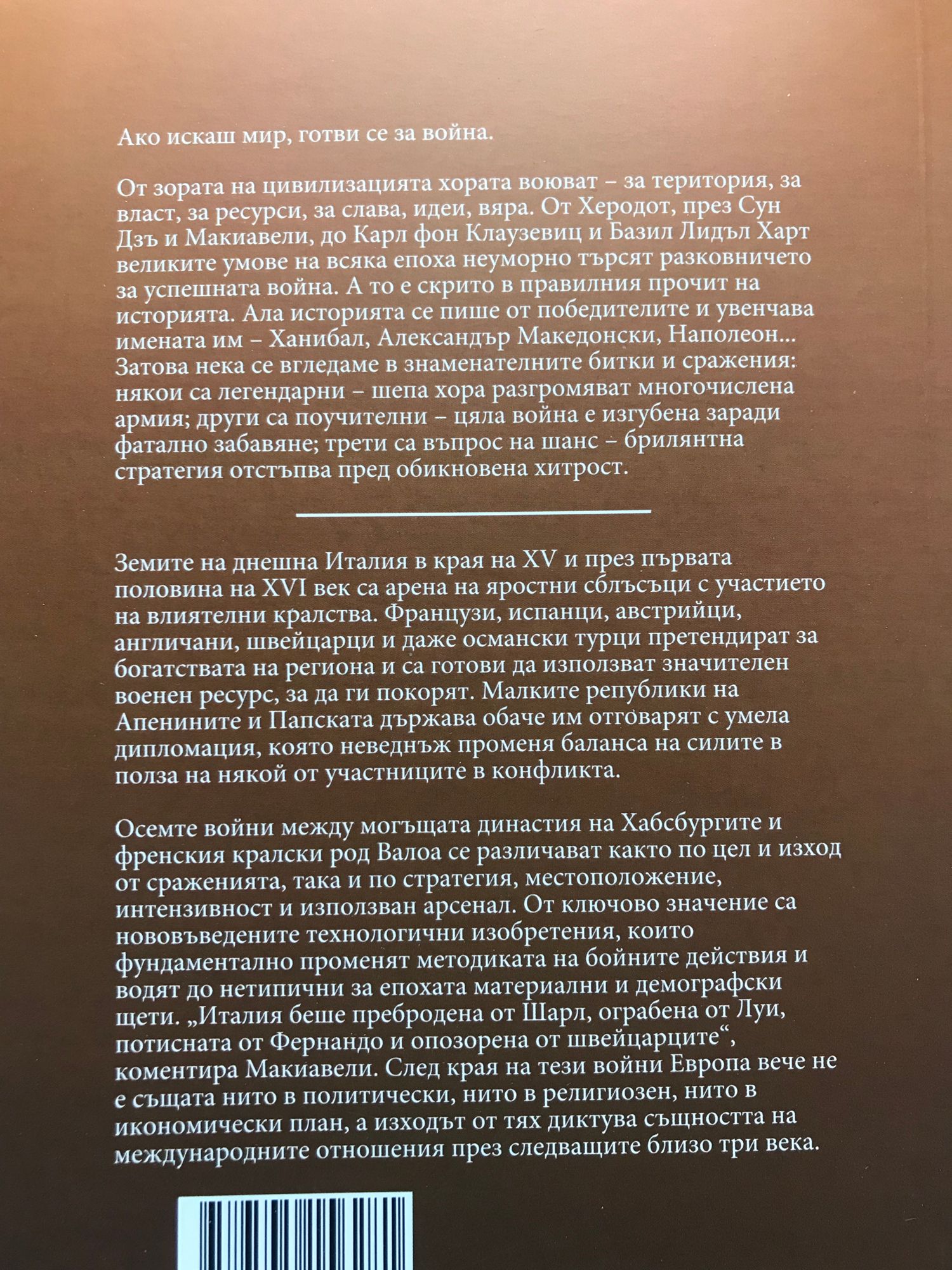 От зората на цивилизацията хората воюват – за територия, за власт, за ресурси, за слава, идеи, вяра. От Херодот, през Сун Дзъ и Макиавели, до Карл фон Клаузевиц и Базил Лидъл Харт великите умове на всяка епоха неуморно търсят разковничето за успешната война. А то е скрито в правилния прочит на историята. Ала историята се пише от победителите и увенчава имената им – Ханибал, Александър Македонски, Наполеон... Затова нека се вгледаме в знаменателните битки и сражения: някои са легендарни – шепа хора разгромяват многочислена армия; други са поучителни – цяла война е изгубена заради фатално забавяне; трети са въпрос на шанс – брилянтна стратегия отстъпва пред обикновена хитрост. Земите на днешна Италия в края на XV и през първата половина на XVI век са арена на яростни сблъсъци с участието на влиятелни кралства. Французи, испанци, австрийци, англичани, швейцарци и даже османски турци претендират за богатствата на региона и са готови да използват значителен военен ресурс, за да ги покорят. Малките републики на Апенините и Папската държава обаче им отговарят с умела дипломация, която неведнъж променя баланса на силите в полза на някой от участниците в конфликта. Осемте войни между могъщата династия на Хабсбургитеи френския кралски род Валоа се различават както по цел и изход от сраженията, така и по стратегия, местоположение, интензивност и използван арсенал. От ключово значение са нововъведените технологични изобретения, които фундаментално променят методиката на бойните действия и водят до нетипични за епохата материални и демографски щети. „Италия беше пребродена от Шарл, ограбена от Луи, потисната от Фернандо и опозорена от швейцарците“, коментира Макиавели. След края на тези войни Европа вече не е същата нито в политически, нито в религиозен, нито в икономически план, а изходът от тях диктува същността на международните отношения през следващите близо три века.