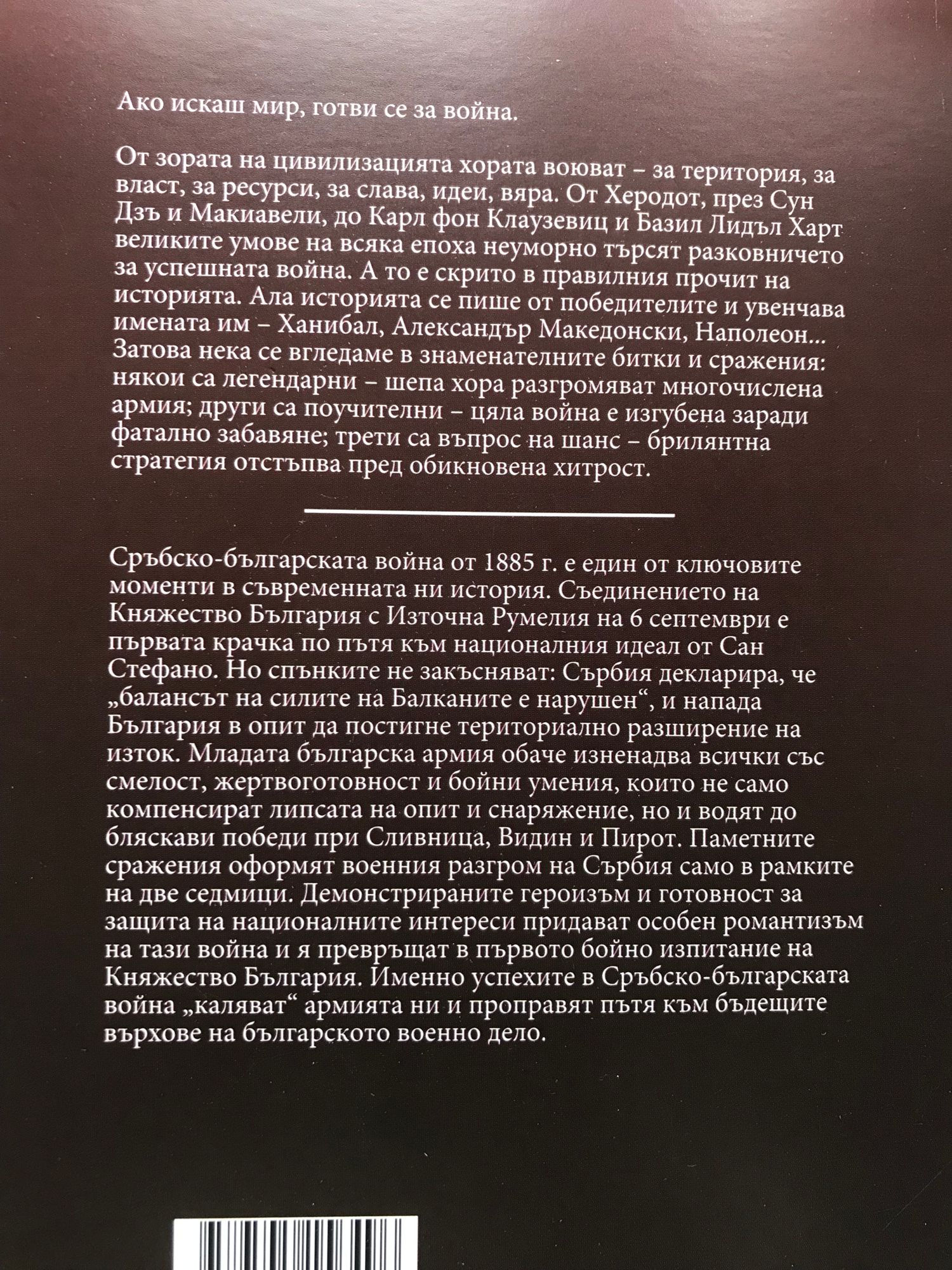 Ако искаш мир, готви се за война. От зората на цивилизацията хората воюват – за територия, за власт, за ресурси, за слава, за идеи, за вяра. От Херодот, през Сун Дзъ и Макиавели, до Карл фон Клаузевиц и Базил Лидъл Харт великите умове на всяка епоха неуморно търсят разковничето за успешната война. А то е скрито в правилния прочит на историята. Ала историята се пише от победителите и увенчава имената им – Ханибал, Александър Македонски, Наполеон... Затова нека се вгледаме в знаменателните битки и сражения: някои са легендарни – шепа хора разгромяват многочислена армия; други са поучителни – цяла война е изгубена заради фатално забавяне; трети са въпрос на шанс – брилянтна стратегия отстъпва пред обикновена хитрост. Сръбско-българската война от 1885 г. е един отключовите моменти в съвременната ни история. Съединението на Княжество България с Източна Румелия на 6 септември е първата крачка по пътя към националния идеал от Сан Стефано. Но спънките не закъсняват: Сърбия декларира, че „балансът на силите на Балканите е нарушен“, и напада България в опит да постигне териториално разширение на изток. Младата българска армия обаче изненадва всички със смелост, жертвоготовност и бойни умения, които не само компенсират липсата на опит и снаряжение, но и водят до бляскави победи при Сливница, Видин и Пирот. Паметните сражения оформят военния разгром на Сърбия само в рамките на две седмици. Демонстрираните героизъм и готовност за защита на националните интереси придават особен романтизъм на тази война и я превръщат в първото бойно изпитание на Княжество България. Именно успехите в Сръбско-българската война „каляват“ армията ни и проправят пътя към бъдещите върхове на българското военно дело.