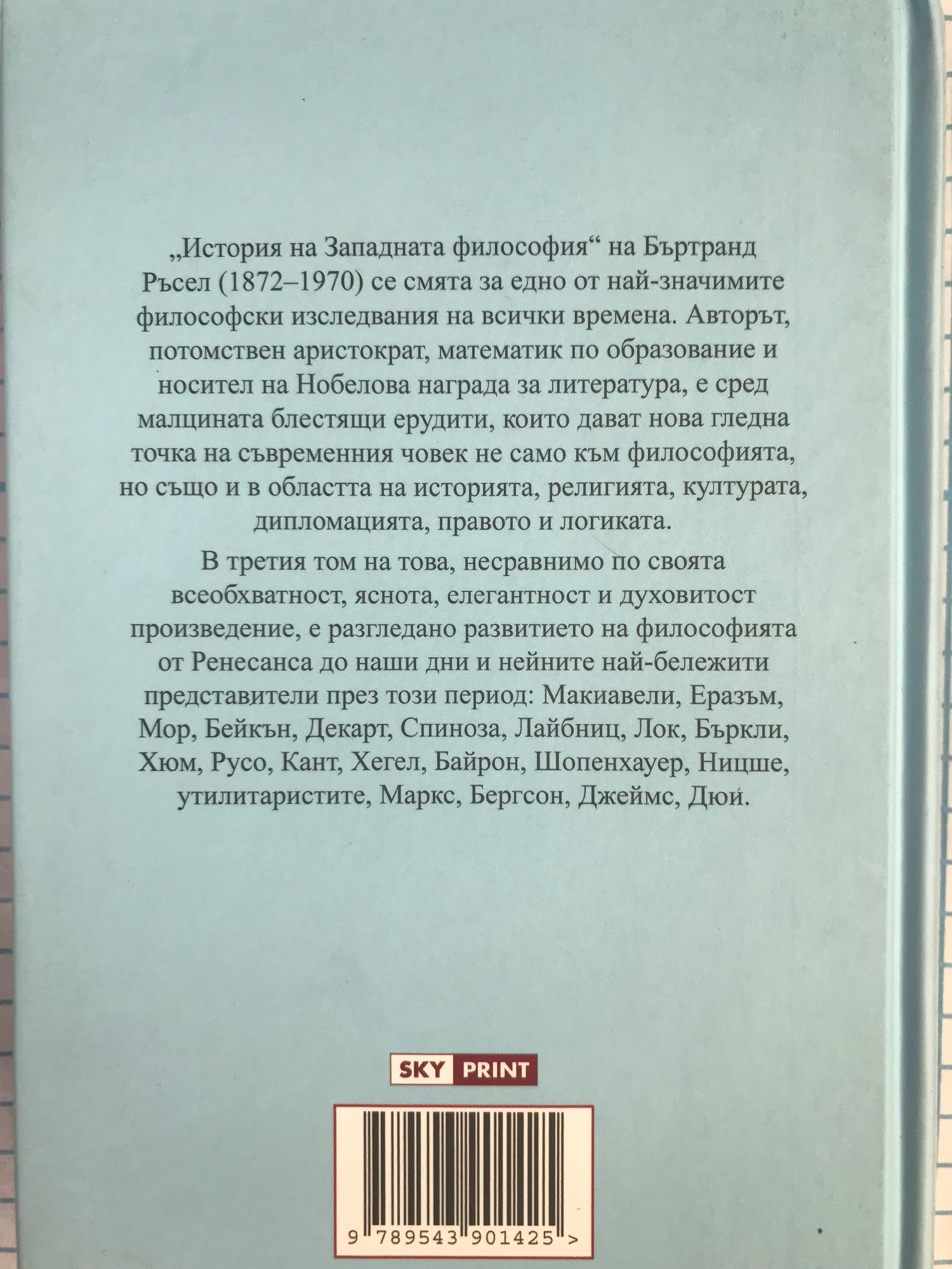 В третия том на това несравнимо по своята всеобхватност, яснота, елегантност и духовитост произведение, е разгледано развитието на философията от Ренесанса до наши дни и нейните най-бележити представители през този период: Макиавели, Еразъм, Мор, Бейкън, Декарт, Спиноза, Лайбниц, Лок, Бъркли, Хюм, Русо, Кант, Хегел, Байрон, Шопенхауер, Ницше, утилитаристите, Маркс, Бергсон, Джеймс, Дюи.