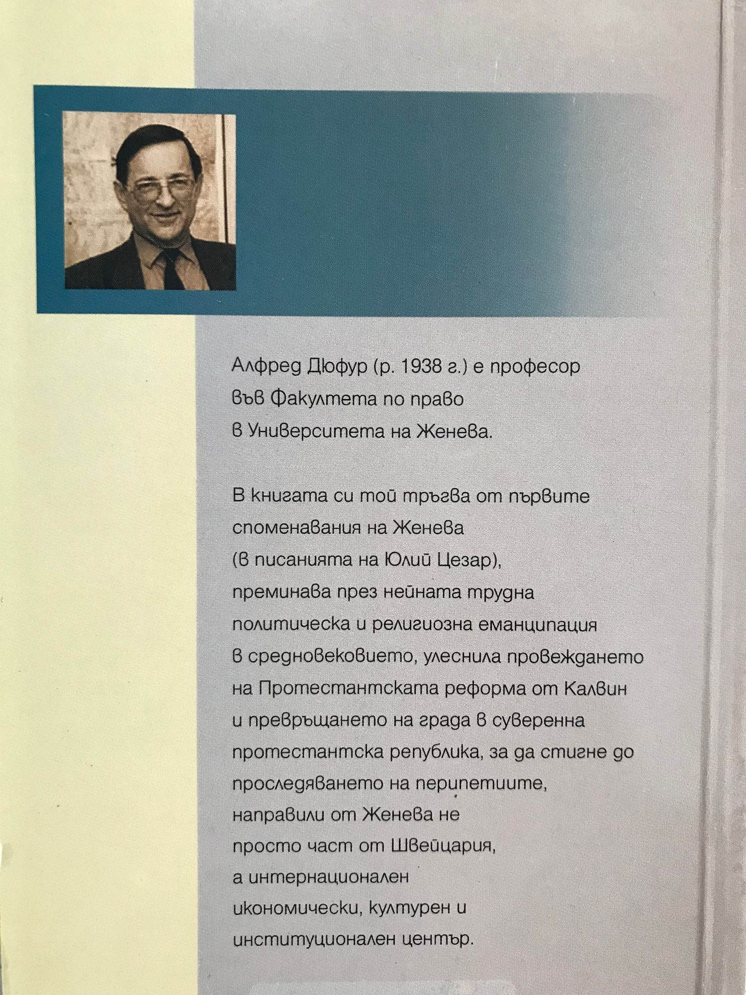 Алфред Дюфур е професор във Факултета по право в Университета на Женева. В книгата си той тръгва от първите споменавания на Женева /в писанията на Юлий Цезар/, преминава през нейната трудна политическа и религиозна еманципация в средновековието, улеснила провеждането на Протестантската реформа на Калвин и превръщането на града в суверенна протестантска република, за да стигне до проследяването на перипетиите, направили от Женева не просто част от Швейцария, а интернационален икономически, културен и институционален център.