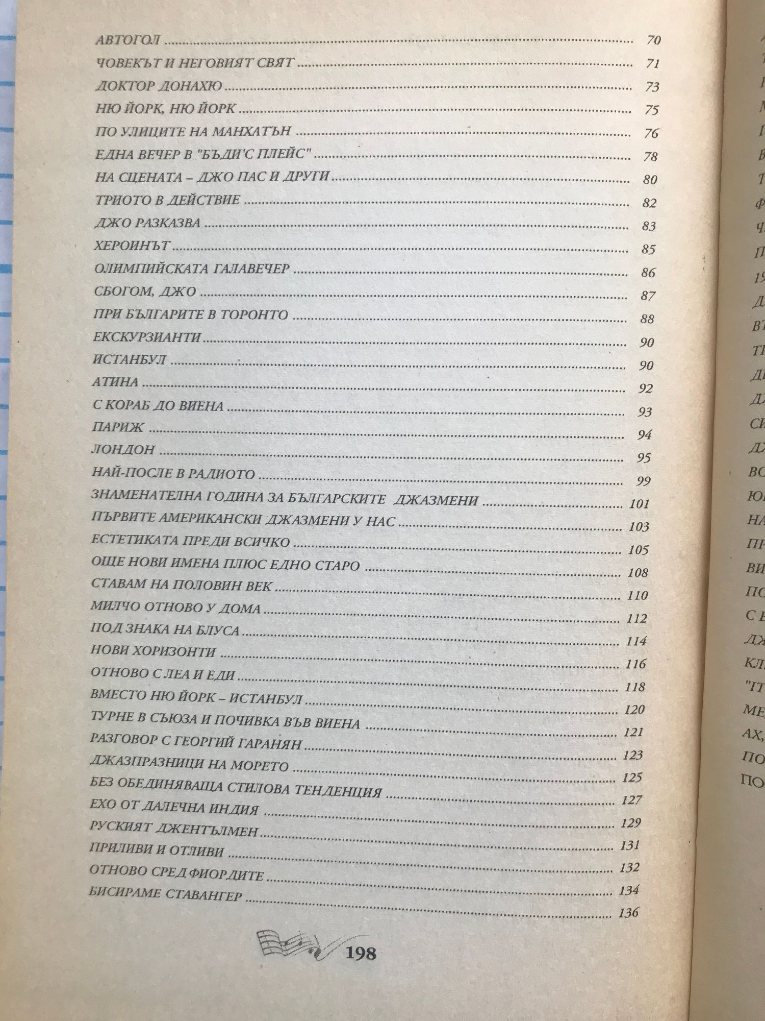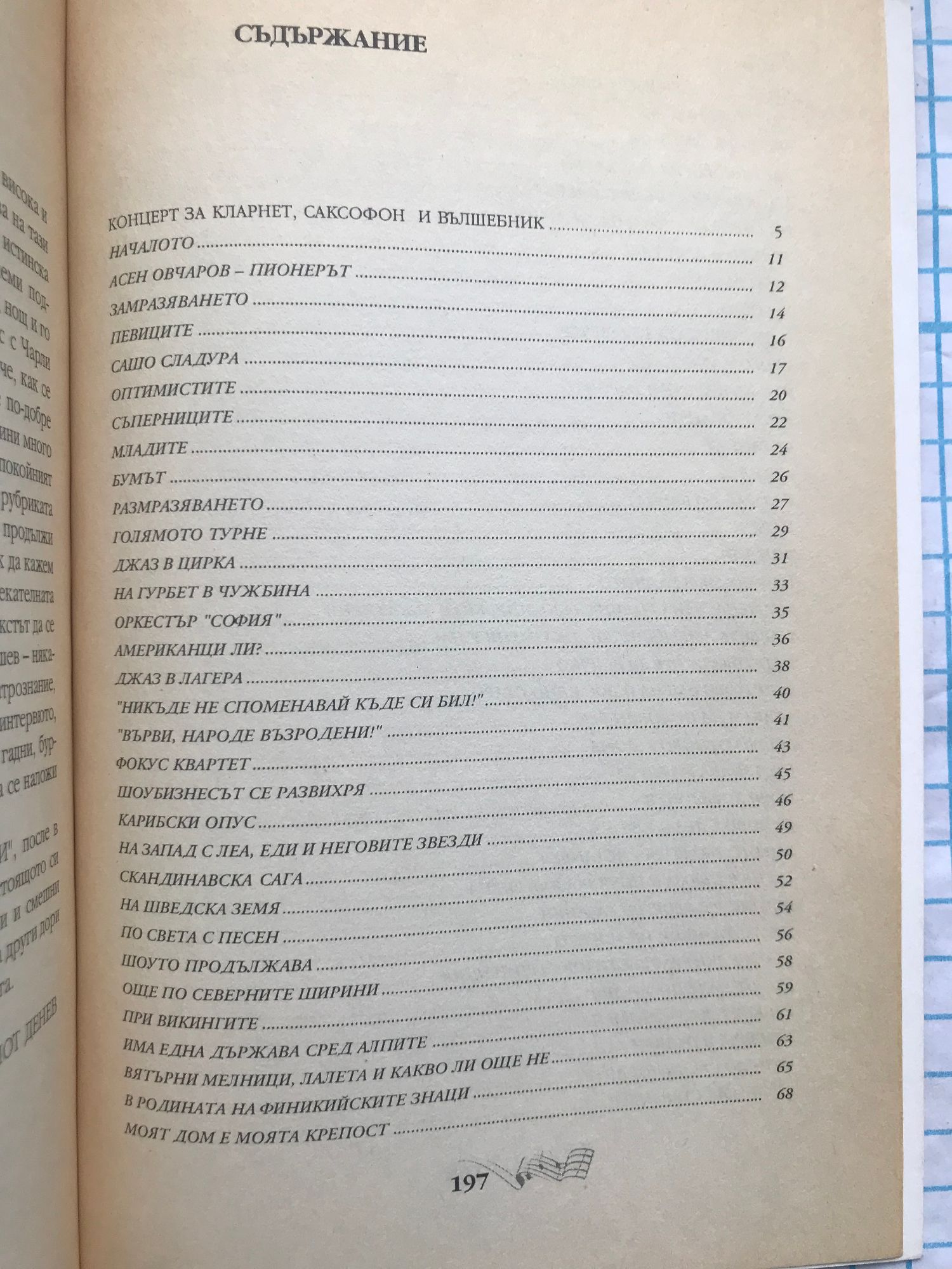 Книгата представлява спомени от живота на автора,свързани с някои събития на джазсцената у нас и в чужбина от 55г. Насам.Главните герои в нея са предимно музиканти от гилдията на шоубизнеса.