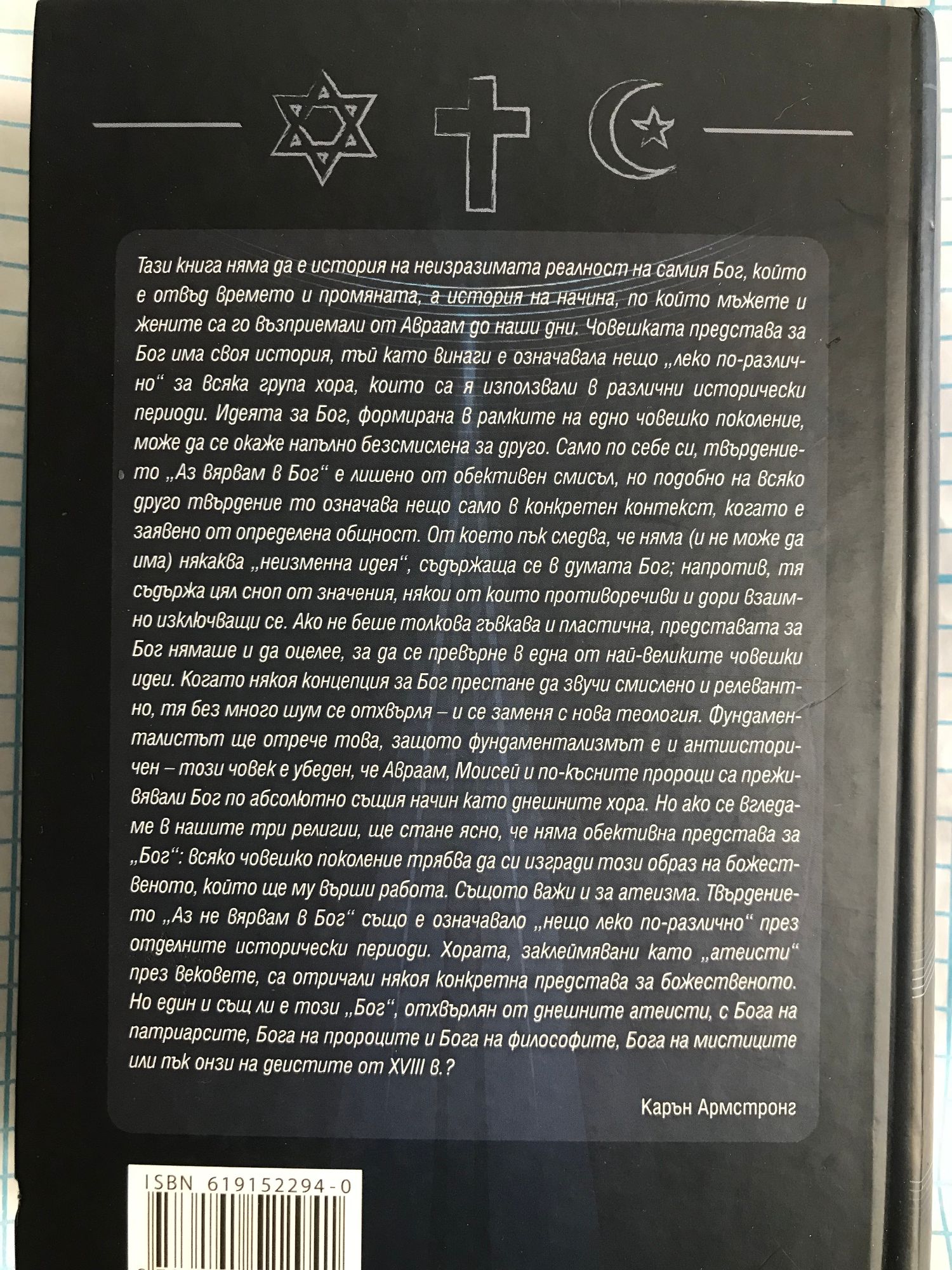 „Тази книга няма да е история на неизразимата реалност на самия Бог, който е отвъд времето и промяната, а история на начина, по който мъжете и жените са го възприемали от Авраам до наши дни. Човешката представа за Бог има своя история, тъй като винаги е означавала нещо „леко по-различно“ за всяка група хора, които са я използвали в различни исторически периоди. Идеята за Бог, формирана в рамките на едно човешко поколение, може да се окаже напълно безсмислена за друго. Само по себе си, твърдението „Аз вярвам в Бог“ е лишено от обективен смисъл, но подобно на всяко друго твърдение то означава нещо само в конкретен контекст, когато е заявено от определена общност. От което пък следва, че няма (и не може да има) някаква „неизменна идея“, съдържаща се в думата Бог; напротив, тя съдържа цял сноп от значения, някои от които противоречиви и дори взаимно изключващи се. Ако не беше толкова гъвкава и пластична, представата за Бог нямаше и да оцелее, за да се превърне в една от най-великите човешки идеи. Когато някоя концепция за Бог престане да звучи смислено и релевантно, тя без много шум се отхвърля – и се заменя с нова теология. Фундаменталистът ще отрече това, защото фундаментализмът е и антиисторичен – този човек е убеден, че Авраам, Моисей и по-късните пророци са преживявали Бог по абсолютно същия начин като днешните хора. Но ако се вгледаме в нашите три религии, ще стане ясно, че няма обективна представа за „Бог“: всяко човешко поколение трябва да си изгради този образ на божественото, който ще му върши работа. Същото важи и за атеизма. Твърдението „Аз не вярвам в Бог“ също е означавало „нещо леко по-различно“ през отделните исторически периоди. Хората, заклеймявани като „атеисти“ през вековете, са отричали някоя конкретна представа за божественото. Но един и същ ли е този „Бог“, отхвърлян от днешните атеисти, с Бога на патриарсите, Бога на пророците и Бога на философите, Бога на мистиците или пък онзи на деистите от ХVІІІ в.?“
