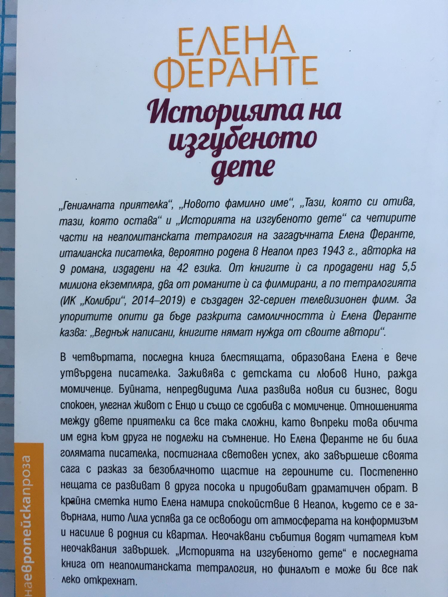 В четвъртата, последна книга блестящата, образована Елена е вече утвърдена писателка. Заживява с детската си любов Нино, ражда момиченце. Буйната, непредвидима Лила развива новия си бизнес, води спокоен, улегнал живот с Енцо и също се сдобива с момиченце. Отношенията между двете приятелки са все така сложни, като въпреки това обичта им една към друга не подлежи на съмнение. Но Елена Феранте не би била голямата писателка, постигнала световен успех, ако завършеше своята сага с разказ за безоблачното щастие на героините си. Постепенно нещата се развиват в друга посока и придобиват драматичен обрат. В крайна сметка нито Елена намира спокойствие в Неапол, където се е завърнала, нито Лила успява да се освободи от атмосферата на конформизъм и насилие в родния си квартал. Неочаквани събития водят читателя към неочаквания завършек. „Историята на изгубеното дете“ е последната книга от неаполитанската тетралогия, но финалът е може би все пак леко открехнат.