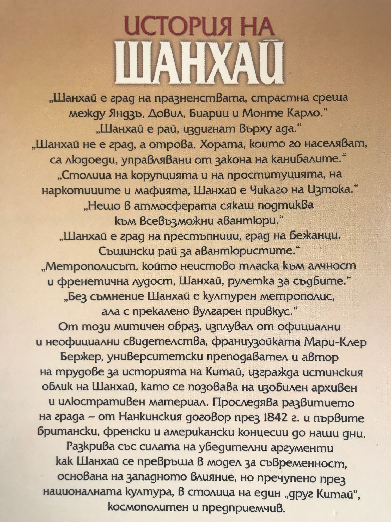 "Шанхай е град на празненствата, страстна среща между Яндзъ, Довил, Биариц и Монте Карло." "Шанхай е рай, издигнат върху ада." "Шанхай не е град, а отрова. Хората, които го населяват, са людоеди, управлявани от закона на канибалите." "Столица на корупцията и на проституцията, на наркотиците и мафията, Шанхай е Чикаго на Изтока." "Нещо в атмосферата сякаш подтиква към всевъзможни авантюри." "Шанхай е град на престъпници, град на бежанци. Същински рай за авантюристите." "Метрополисът, който неистово тласка към алчност и френетична лудост, Шанхай, рулетка за съдбите." "Без съмнение Шанхай е културен метрополис, ала с прекалено вулгарен привкус." От този митичен образ, изплувал от официални и неофициални свидетелства, французойката Мари-Клер Бержер, университетски преподавател и автор на трудове за историята на Китай, изгражда истинския облик на Шанхай, като се позовава на изобилен архивен и илюстративен материал. Проследява развитието на града - от Нанкинския договор през 1842 г. и първите британски, френски и американски концесии до наши дни. Разкрива със силата на убедителни аргументи как Шанхай се превръща в модел за съвременност, основана на западното влияние, но пречупено през националната култура, В столица на един "друг Китай", космополитен и предприемчив.