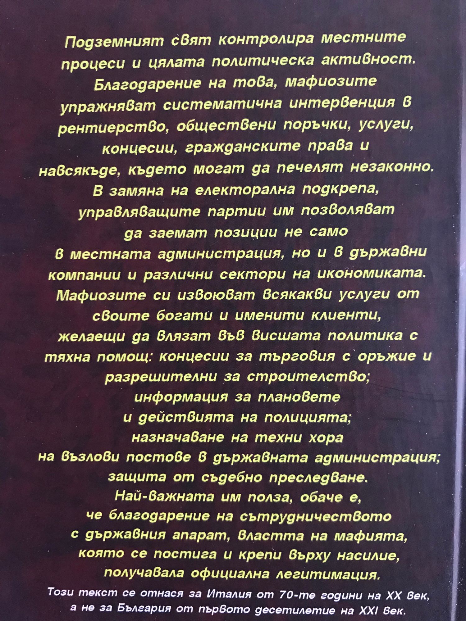 Подземният свят контролира местните процеси и цялата политическа активност. Благодарение на това, мафиозите упражняват систематична интервенция в рентиерство, обществени поръчки, услуги, концесии, гражданските права и навсякъде, където могат да печелят незаконно. В замяна на електорална подкрепа, управляващите партии им позволяват да заемат позиции не само в местната администрация, но и в държавни компании и различни сектори на икономиката. Мафиозите си извоюват всякакви услуги от своите богати и именити клиенти, желаещи да влязат във висшата политика с тяхна помощ: концесии за търговия с оръжие и разрешителни за строителство; информация за плановете и действията на полицията; назначаване на техни хора на възлови постове в държавната администрация; защита от съдебно преследване. Най-важната им полза, обаче е, че благодарение на сътрудничеството с държавния апарат, властта на мафията, която се постига и крепи върху насилие, получавала официална легитимация. Този текст се отнася за Италия от 70-те години на XX век, а не за България от първото десетилетие на XXI век.