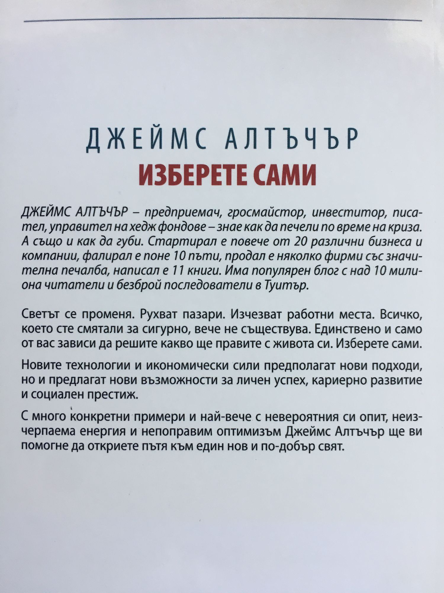 Светът се променя. Рухват пазари. Изчезват работни места. Всичко, което сте смятали за сигурно, вече не съществува. Единствено и само от вас зависи да решите какво ще правите с живота си. Изберете сами. Новите технологии и икономически сили предполагат нови подходи, но и предлагат нови възможности за личен успех, кариерно развитие и социален престиж. С много конкретни примери и най-вече с невероятния си опит, неизчерпаема енергия и непоправим оптимизъм Джеймс Алтъчър ще ви помогне да откриете пътя към един нов и по-добър свят. ♦ ♦ ♦ Джеймс Алтъчър – предприемач, гросмайстор, инвеститор, писател, управител на хедж фондове – знае как да печели по време на криза. А също и как да губи. Стартирал е повече от 20 различни бизнеса и компании, фалирал е поне 10 пъти, продал е няколко фирми със значителна печалба, написал е 11 книги. Има популярен блог с над 10 милиона читатели и безброй последователи в Туитър.