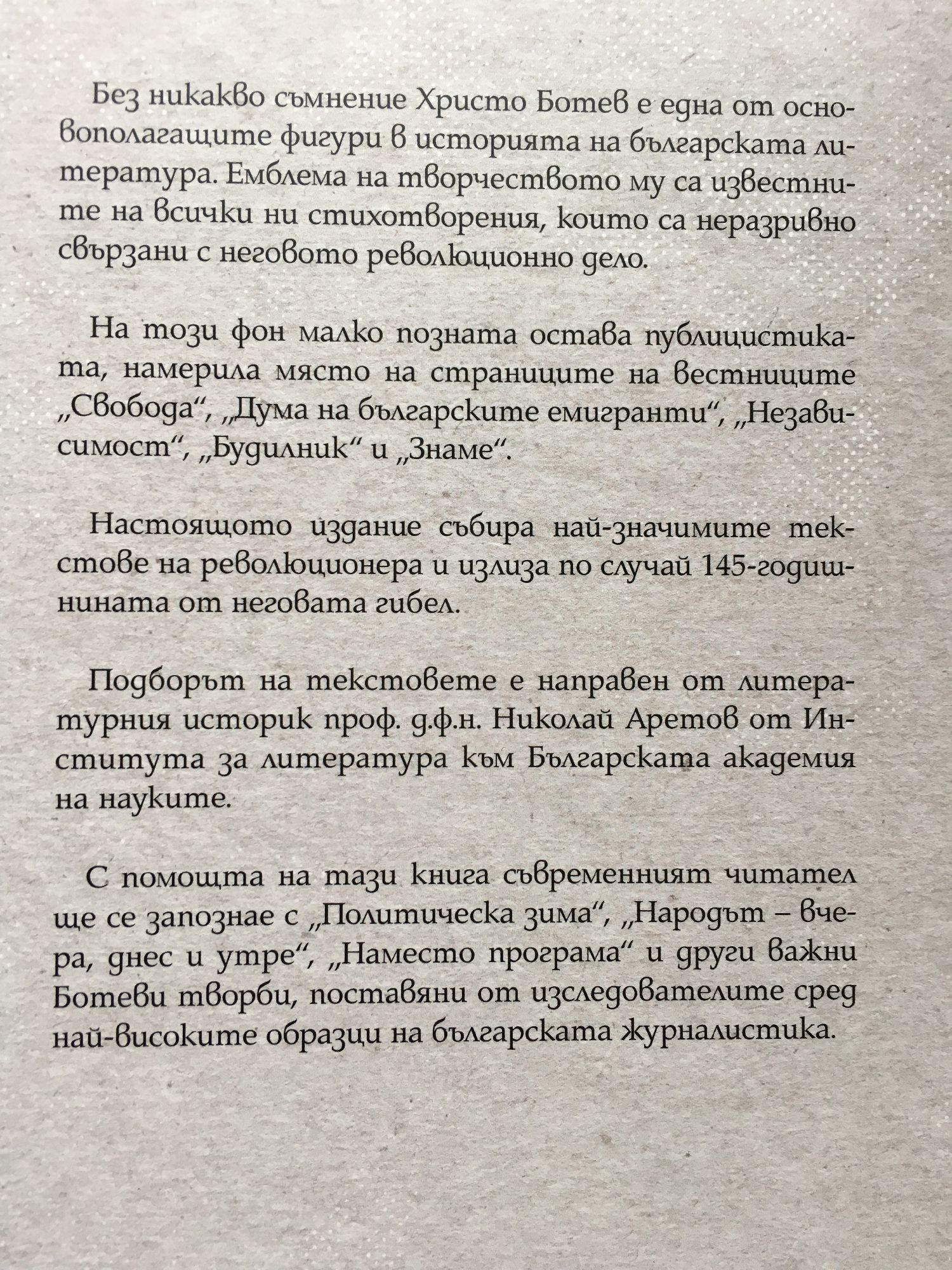Без никакво съмнение Христо Ботев е една от основополагащите фигури в историята на българската литература. Емблема на творчеството му са известните на всички ни стихотворения, които са неразривно свързани с неговото революционно дело. На този фон малко позната остава публицистиката, намерила място на страниците на вестниците „Свобода“, „Дума на българските емигранти“, „Независимост“, „Будилник“ и „Знаме“. Настоящото издание събира най-значимите текстове на революционера и излиза по случай 145-годишнината от неговата гибел. Подборът на текстовете е направен от литературния историк проф. д.ф.н. Николай Аретов от Института за литература към Българската академия на науките. С помощта на тази книга съвременният читател ще се запознае с „Политическа зима“, „Народът – вчера, днес и утре“, „Наместо програма“ и други важни Ботеви творби, поставяни от изследователите сред най-високите образци на българската журналистика.