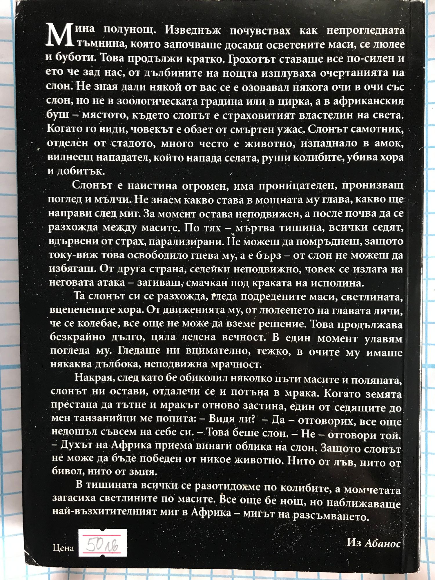 Накрая, след като бе обиколил няколко пъти масите и поляната, слонът ни остави, отдалечи се и потъна в мрака. Когато земята престана да тътне и мракът отново застина, един от седящите до мен танзанийци ме попита: - Видя ли? – Да — отговорих, все още недошъл съвсем на себе си. - Това беше слон. - Не - отговори той. - Духът на Африка приема винаги облика на слон. Защото слонът не може да бъде победен от никое животно. Нито от лъв, нито от бивол, нито от змия." Из “Абанос”