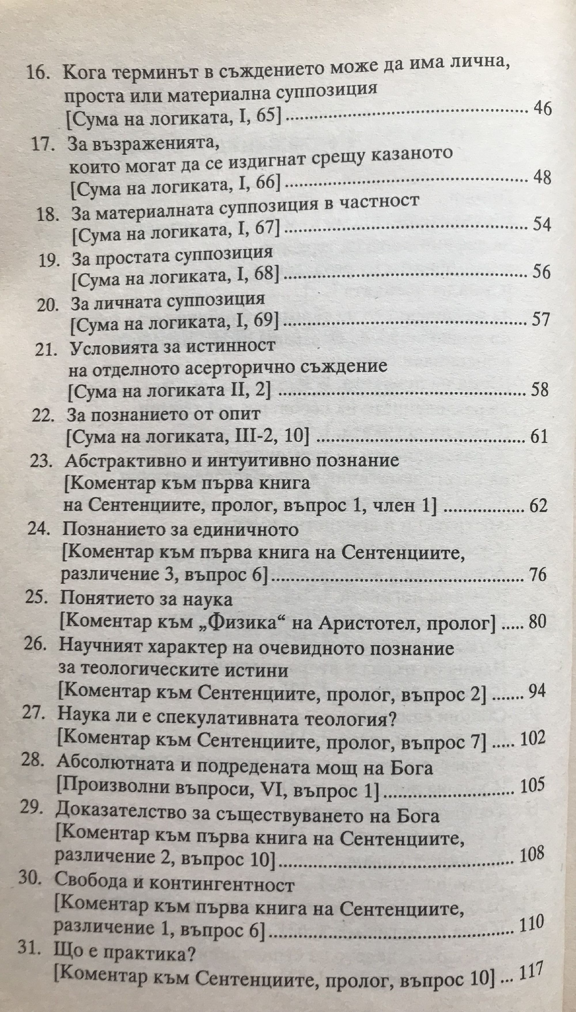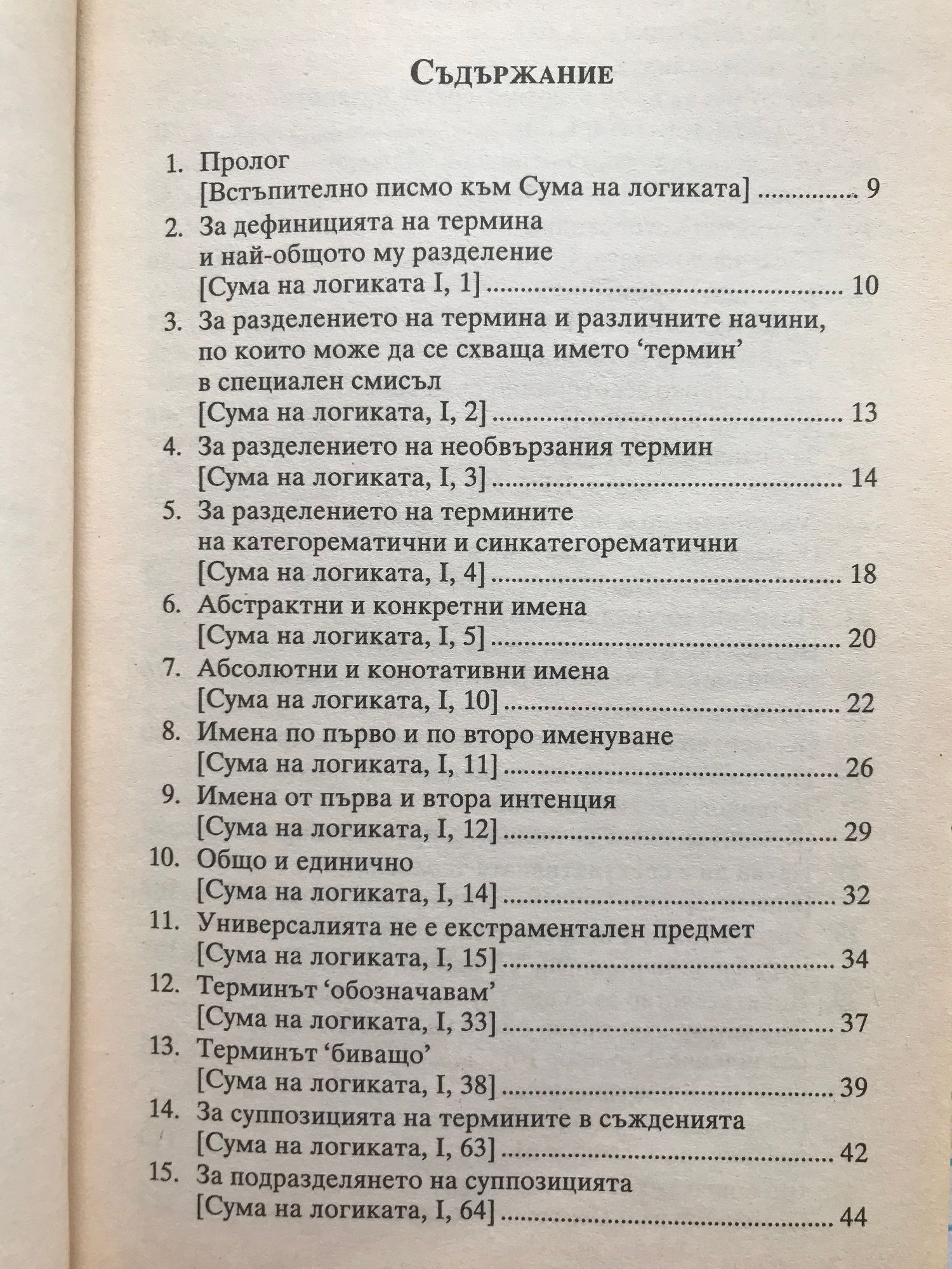 ПРОЛОГ ( Встъпително писмо към Сума на логиката ) 1. Отдавна, обични ми брате и приятелю, ме подтикваш с писмата си да събера в един трактат някои правила на логическото изкуство и да ги предоставя на вниманието ти. Понеже, воден от любов към твоето напредване и истината, не мога да отхвърля молбите ти, ще се опитам да захвана онова, за което ме увещаваш: едно дело трудно, но, струва ми се, плодоносно както за теб, така и за мен. 2. Логиката е най-пригодният инструмент на всички изкуства, без който не може да се стигне до съвършено познаване на една наука. За разлика от материалните инструменти, тя не се похабява от честата употреба, а постоянно нараства чрез усърдното занимание с която и да е от другите науки. Както механикът, който не познава съвършено инструмента си, добива по-пълно знание за него при употребата му, така и познавачът на основоположните принципи на логиката, навлизайки в проблемите на другите науки, заедно с това натрупва по-голяма опитност в самото логическо изкуство. Затова, мисля, простонародната приказка, че „логиката е преходно изкуство", хваща място само при онези, които са немарливи в стремежа си към мъдростта. 3. Тъй като често се случва млади хора да се посвещават на тънкостите в теологията и другите дисциплини, преди да са добили голям опит в логиката, поради което се сблъскват с неразрешими за тях трудности, които за други са малки или просто несъществуващи, и изпадат в многообразни заблуди, обявявайки истинни доказателства за софистика и приемайки софизми за доказателства, оформих писания тук трактат така, че в процеса на изложението да пояснявам правилата както с философски, така и с богословски примери.
