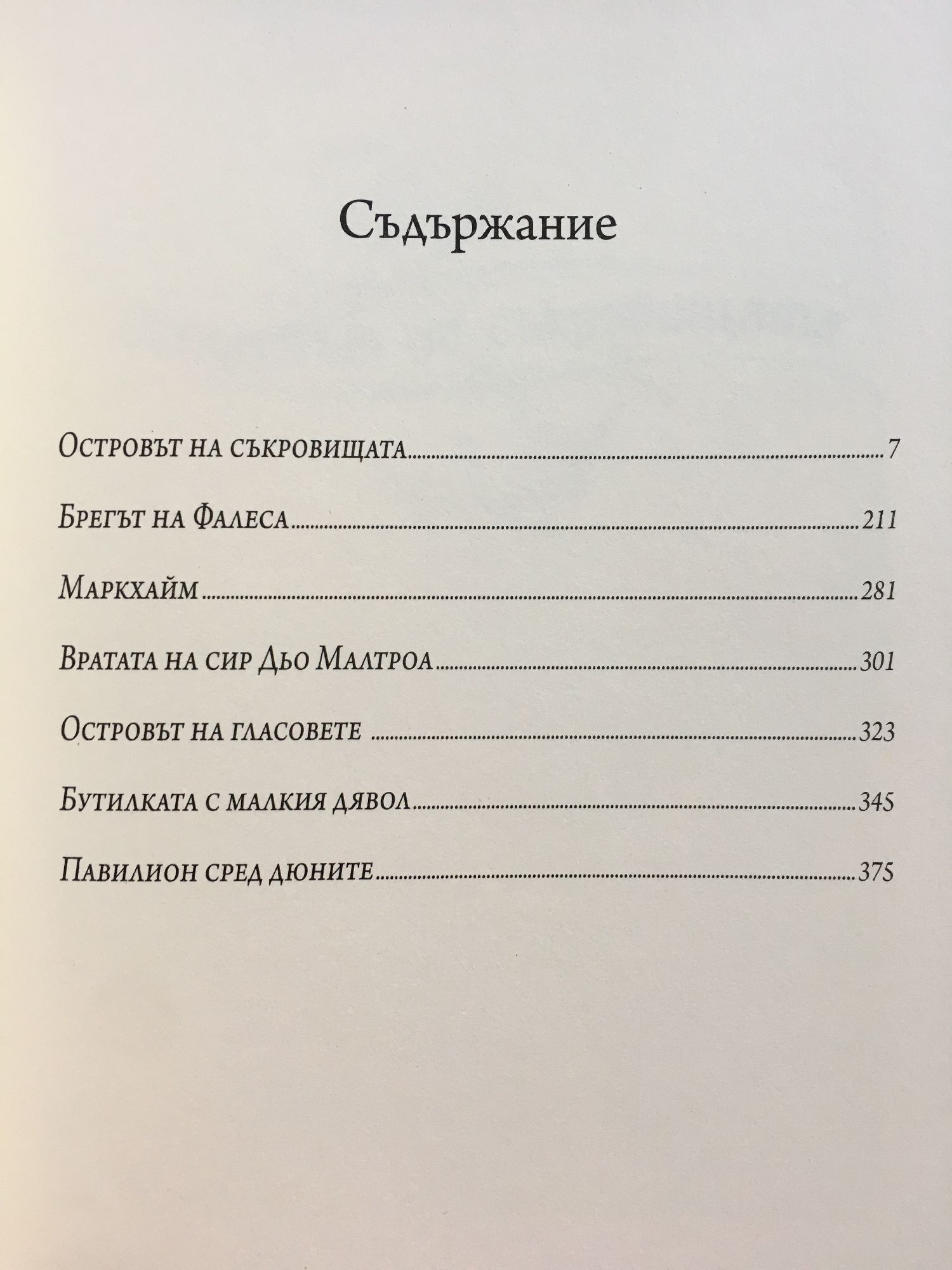 Брегът на Фалеса, Маркхайм, Вратата на сир Дьо Малтроа, Островът на гласовете, Бутилката с малкия дявол и Павилион сред дюните