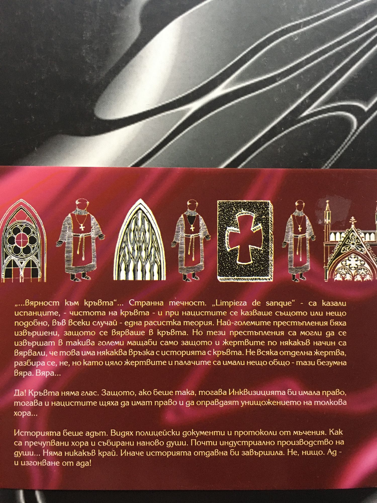 "...Вярност към кръвта"... Странна течност. „Limpieza de sanque" - са казали испанците, - чистота на кръвта - и при нацистите се казваше същото или нещо подобно, във всеки случай - една расистка теория. Най-големите престъпления бяха извършени, защото се вярваше в кръвта. Но тези престъпления са могли да се извършат в такива големи мащаби само защото и жертвите по някакъв начин са вярвали, че това има някаква връзка с историята с кръвта. Не всяка отделна жертва, разбира се, не, но като цяло жертвите и палачите са имали нещо общо - тази безумна вяра. Вяра... Да! Кръвта няма глас. Защото, ако беше така, тогава Инквизицията би имала право, тогава и нацистите щяха да имат право и да оправдаят унищожението на толкова хора... Историята беше адът. Видях полицейски документи и протоколи от мъчения. Как са пречупвани хора и събирани наново души. Почти индустриално производство на души... Няма никакъв край. Иначе историята отдавна би завършила. Не, нищо. Ад - и изгонване от ада!