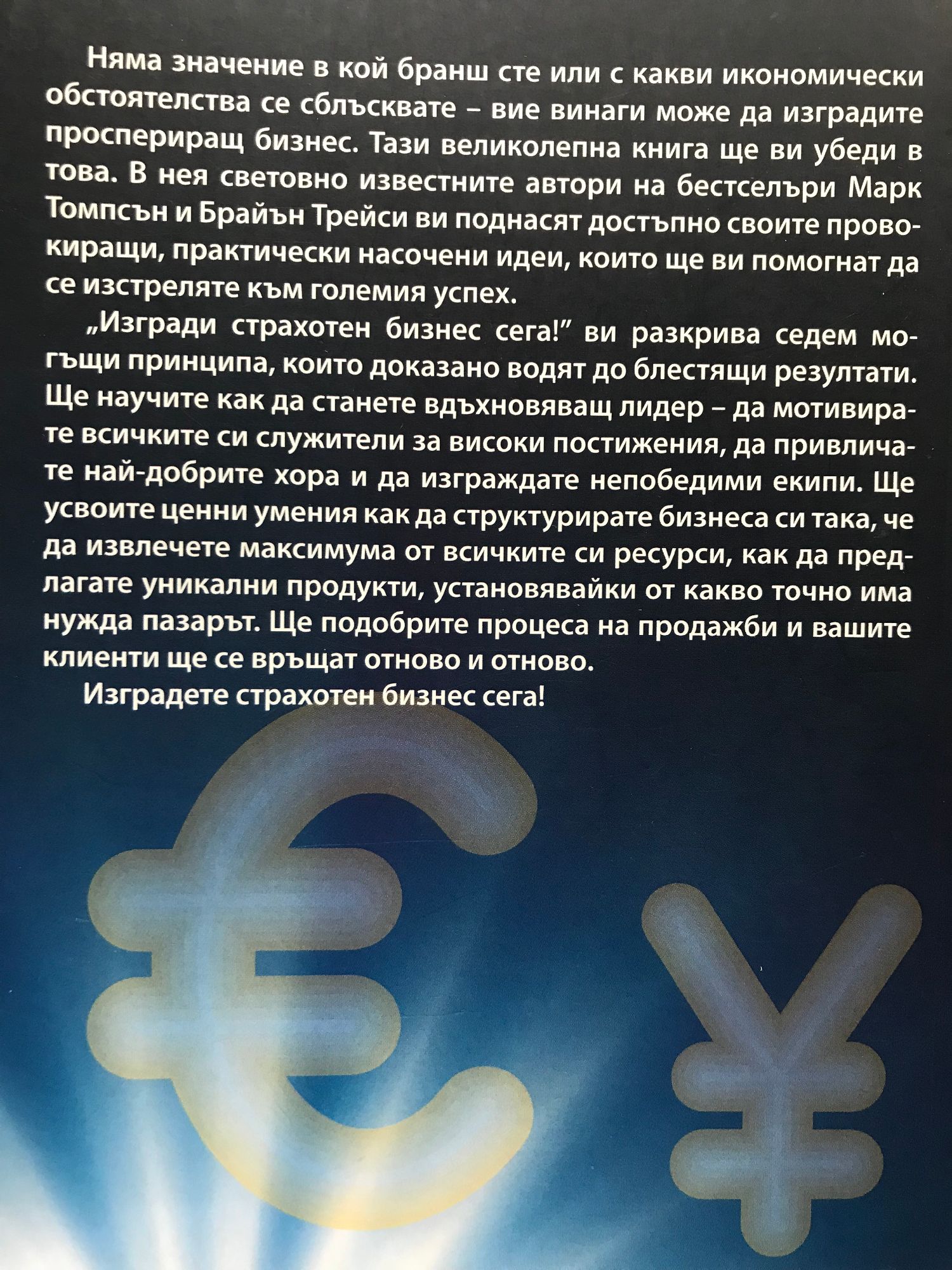„Изгради страхотен бизнес сега!“ ви разкрива седем могъщи принципа, които доказано водят до блестящи резултати. Ще научите как да станете вдъхновяващ лидер – да мотивирате всичките си служители за високи постижения, да привличате най-добрите хора и да изграждате непобедими екипи. Ще усвоите ценни умения как да структурирате бизнеса си така, че да извлечете максимума от всичките си ресурси, как да предлагате уникални продукти, установявайки от какво точно има нужда пазарът. Ще подобрите процеса на продажби и вашите клиенти ще се връщат отново и отново.