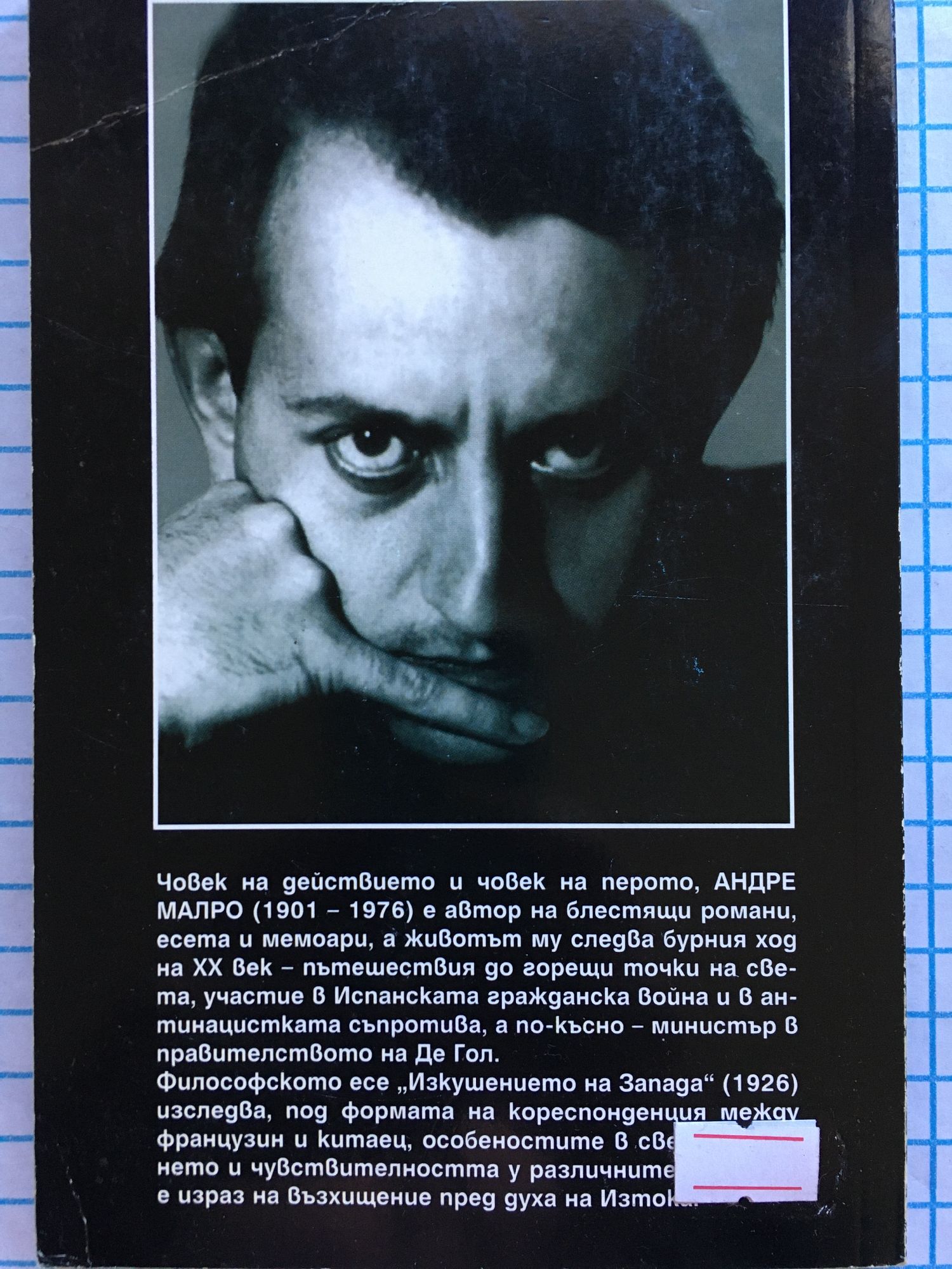 Който дълго гледа маймуни, заприличва на сянката си Малабарска пословица Писмата, съставящи тази книга, са от господин А. Д., французин, двайсет и пет годишен, донейде запознат с китайските творения, и от господин Лин У., китаец, попаднал под въздействието на странната западноевропейска култура - чисто книжна култура, запленила доста от неговите сънародници. Писмата са разменяни, докато авторите им са пътували — първият из Китай, а вторият из Европа. Нека господин Лин не бъде възприеман като олицетворение на Изтока. Подобно олицетворение не би могло да съществува. Той е китаец и като такъв е подвластен на китайската чувствителност и мисъл, които европейските книги не са способни да унищожат. Това е всичко. Тук предлагаме подбрани писма измежду всичките. Издавайки ги, нашето желание е да избистрим хода на две различни чувствителности и да подтикнем читателя към задълбочени и понякога може би неочаквани разсъждения за битието на възприятията и на духа. Човек на действието и човек на перото, АНДРЕ МАЛРО (1901-1976) е автор на блестящи романи, есета и мемоари, а животът му следва бурния ход на XX век - пътешествия до горещи точки на света, участие в Испанската гражданска война и в антинацистката съпротива, а по-късно - министър в правителството на Де Гол.