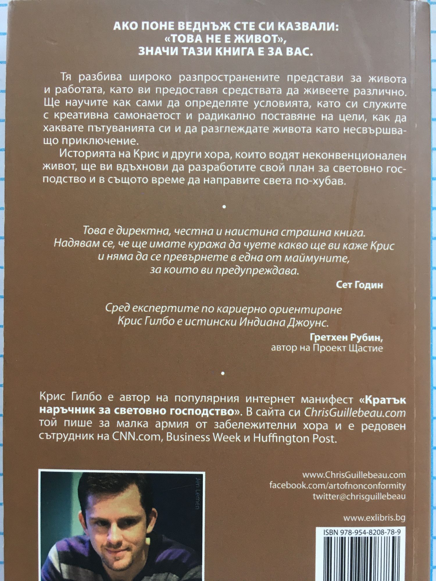 Ако поне веднъж сте си казвали: "Това не е живот", значи тази книга е за вас. Тя разбива широко разпространените представи за живота и работата, като ви предоставя средствата да живеете различно. Ще научите как сами да определяте условията, като си служите с креативна самонаетост и радикално поставяне на цели, как да "хаквате" пътуванията си и да разглеждате живота като несвършващо приключение. Историята на Крис и други хора, които водят неконвенционален живот, ще ви вдъхнови да разработите свой план за световно господство и в същото време да направите света по-хубав. "Това е директна, честна и наистина страшна книга. Надявам се, че ще имате куража да чуете какво ще ви каже Крис и няма да се превърнете в една от маймуните, за които ви предупреждава." Сет Годин