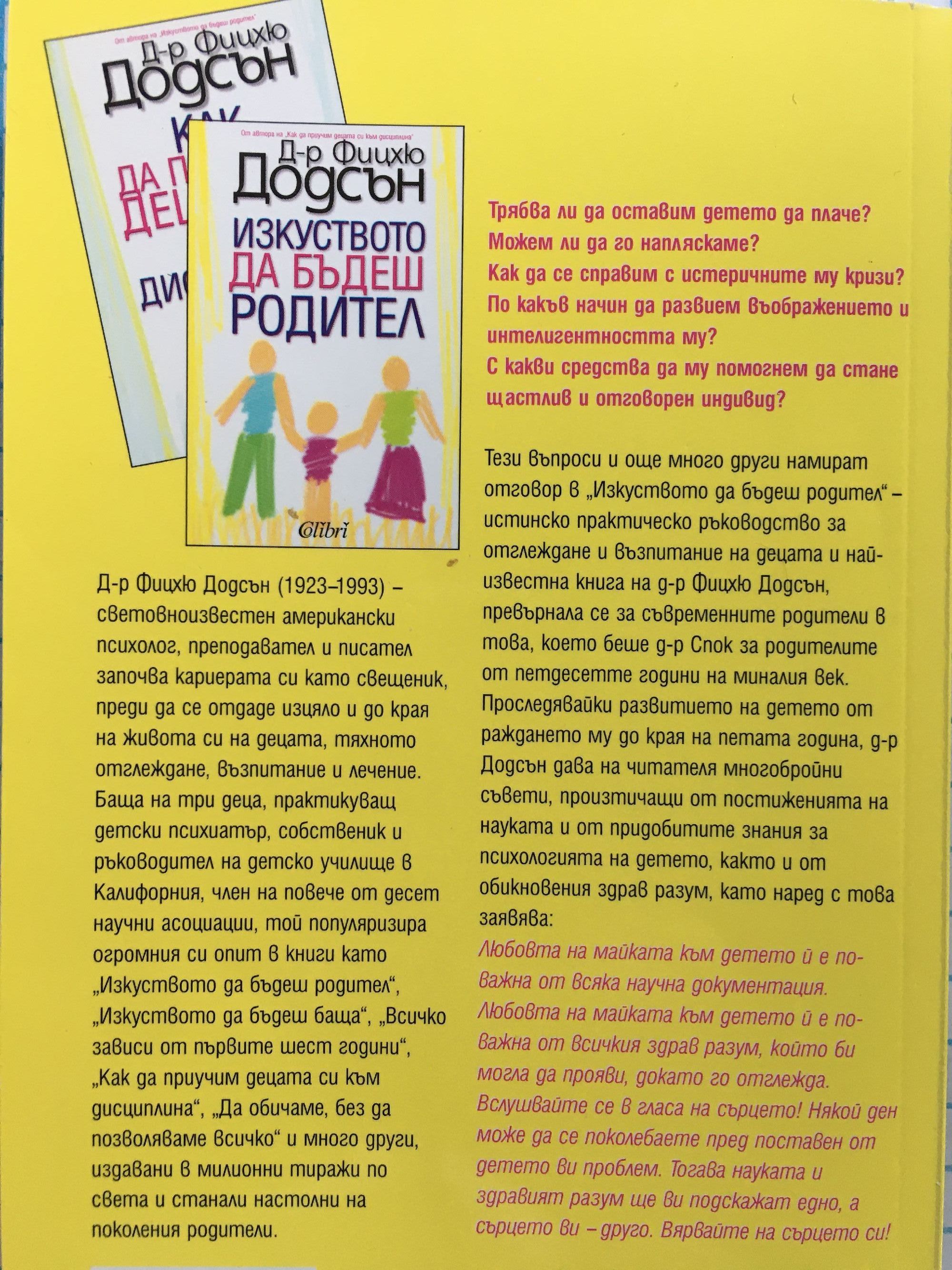Трябва ли да оставим детето да плаче? Можем ли да го напляскаме? Как да се справим с истеричните му кризи? По какъв начин да развием въображението и интелигентността му? С какви средства да му помогнем да стане щастлив и отговорен индивид? Тези въпроси и още много други намират отговор в „Изкуството да бъдеш родител“ - истинско практическо ръководство за отглеждане и възпитание на децата и най-известна книга на д-р Фицхю Додсън, превърнала се за съвременните родители в това, което беше д-р Спок за родителите от петдесетте години на миналия век. Проследявайки развитието на детето от раждането му до края на петата година, д-р Додсън дава на читателя многобройни съвети, произтичащи от постиженията на науката и от придобитите знания за психологията на детето, както и от обикновения здрав разум, като наред с това заявява: Любовта на майката към детето ѝ е по-важна от всяка научна документация. Любовта на майката към детето ѝ е по-важна от всичкия здрав разум, който би могла да прояви, докато го отглежда. Вслушвайте се в гласа на сърцето! Някой ден може да се поколебаете пред поставен от детето ви проблем. Тогава науката и здравият разум ще ви подскажат едно, а сърцето ви - друго. Вярвайте на сърцето си!
