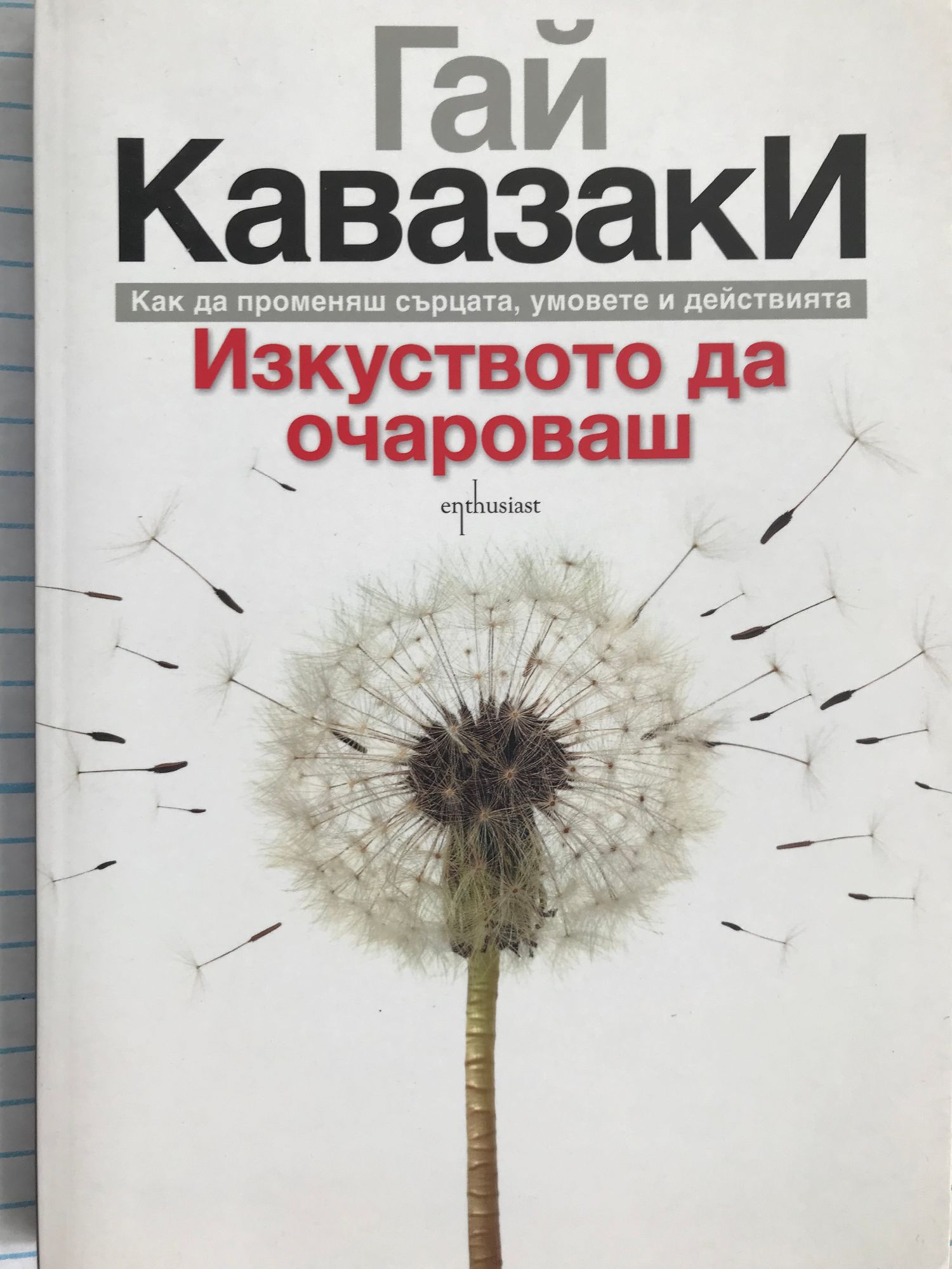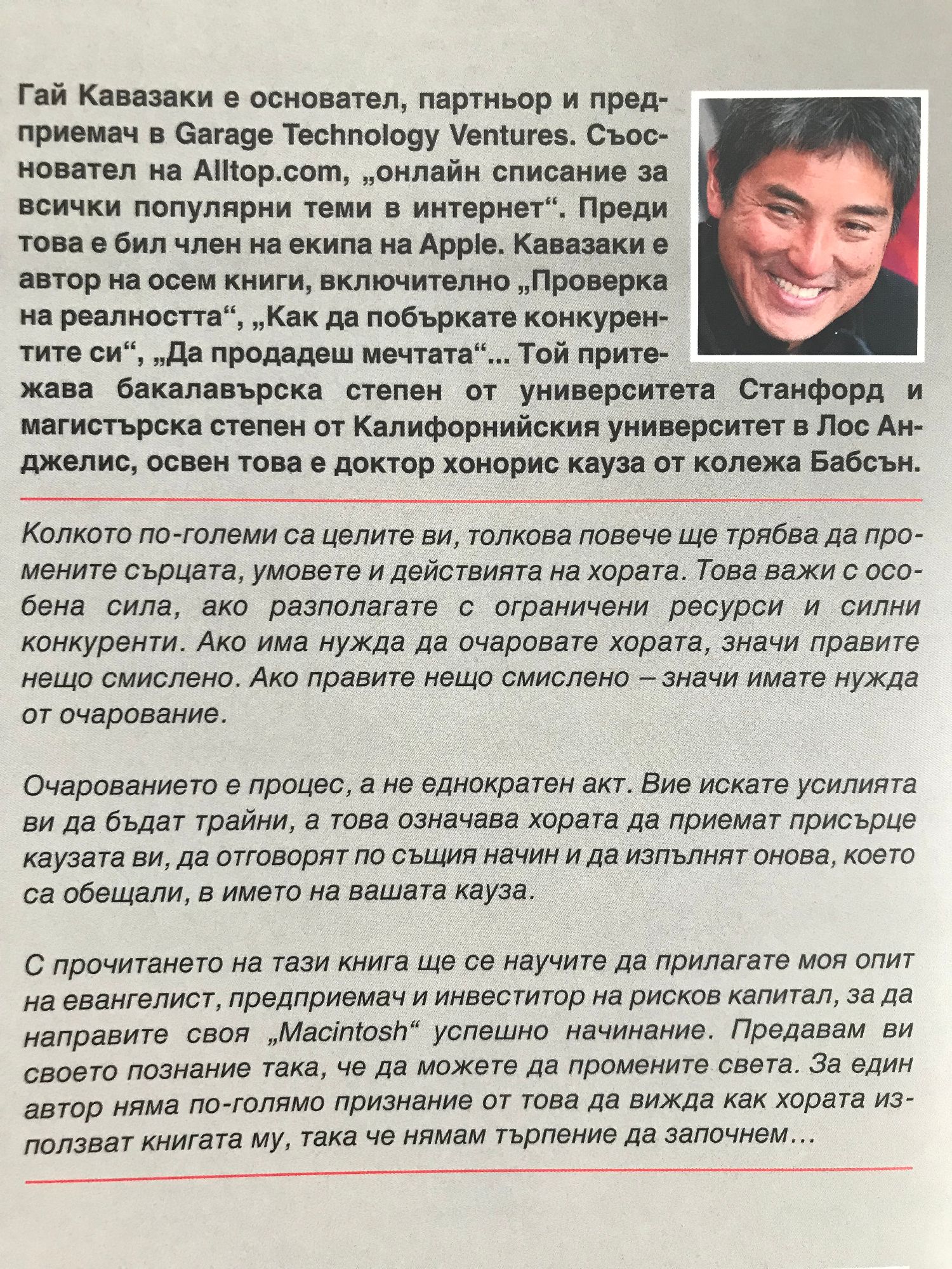 Колкото по-големи са целите ви, толкова повече ще трябва да промените сърцата, умовете и действията на хората. Това важи с особена сила, ако разполагате с ограничени ресурси и силни конкуренти. Ако има нужда да очаровате хората, значи правите нещо смислено. Ако правите нещо смислено – значи имате нужда от очарование. Очарованието е процес, а не еднократен акт. Вие искате усилията ви да бъдат трайни, а това означава хората да приемат присърце каузата ви, да отговорят по същия начин и да изпълнят онова, което са обещали, в името на вашата кауза. С прочитането на тази книга ще се научите да прилагате моя опит на евангелист, предприемач и инвеститор на рисков капитал, за да направите своя „Macintosh“ успешно начинание. Предавам ви своето познание така, че да можете да промените света. За един автор няма по-голямо признание от това, да вижда как хората използват книгата му, така че нямам търпение да започнем... Гай Кавазаки е основател, партньор и предприемач в „Garage Technology Ventures“. Съосновател на Alltop.com, „онлайн списание за всички популярни теми в интернет“. Преди това е бил член на екипа на Apple. Кавазаки е автор на осем книги, включително „Проверка на реалността. Новите оръжия на маркетинга“, „Правила за революционери“, „Как да побъркате конкурентите си“, „Да продадеш мечтата“... Той притежава бакалавърска степен от Университета Станфорд и магистърска степен от Калифорнийския Университет в Лос Анджелис, освен това е доктор хонорис кауза от колежа „Бабсън“.