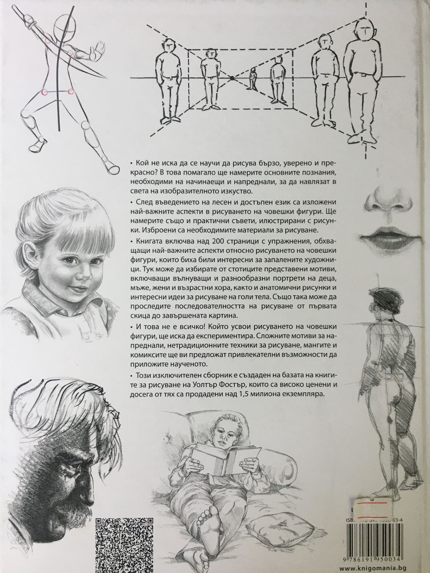 Кой не иска да се научи да рисува бързо, уверено и прекрасно? В това помагало ще намерите основните познания, необходими на начинаещи и напреднали, за да навлязат в света на изобразителното изкуство. След въведението са изложени най-важните аспекти в рисуването на човешки фигури на лесен и достъпен език. Ще намерите също и практични съвети , илюстрирани с рисунки. Изброени са необходимите материали за рисуване. Книгата включва почти 200 страници с упражнения, обхващащи най-важните аспекти относно рисуването на човешки фигури, които биха били интересни за запалените художници. Тук може да избирате от стотиците представени мотиви, включващи вълнуващи и разнообразни портрети на деца, мъже, жени и възрастни хора, както и анатомични рисунки и интересни идеи за рисуване на голи тела. Също така може да проследите последователността на рисуване от първата скица до завършената картина. И това не е всичко! Който усвои рисуването на човешки фигури, ще иска да експериментира. Сложните мотиви за напреднали, нетрадиционните техники за рисуване, мангите и комиксите ще ви предложат привлекателни възможности да приложите наученото. Този изключителен сборник е създаден на базата на книгите за рисуване на Уолтър Фостър, които са високо ценени и досега от тях са продадени над 1,5 милиона бройки.