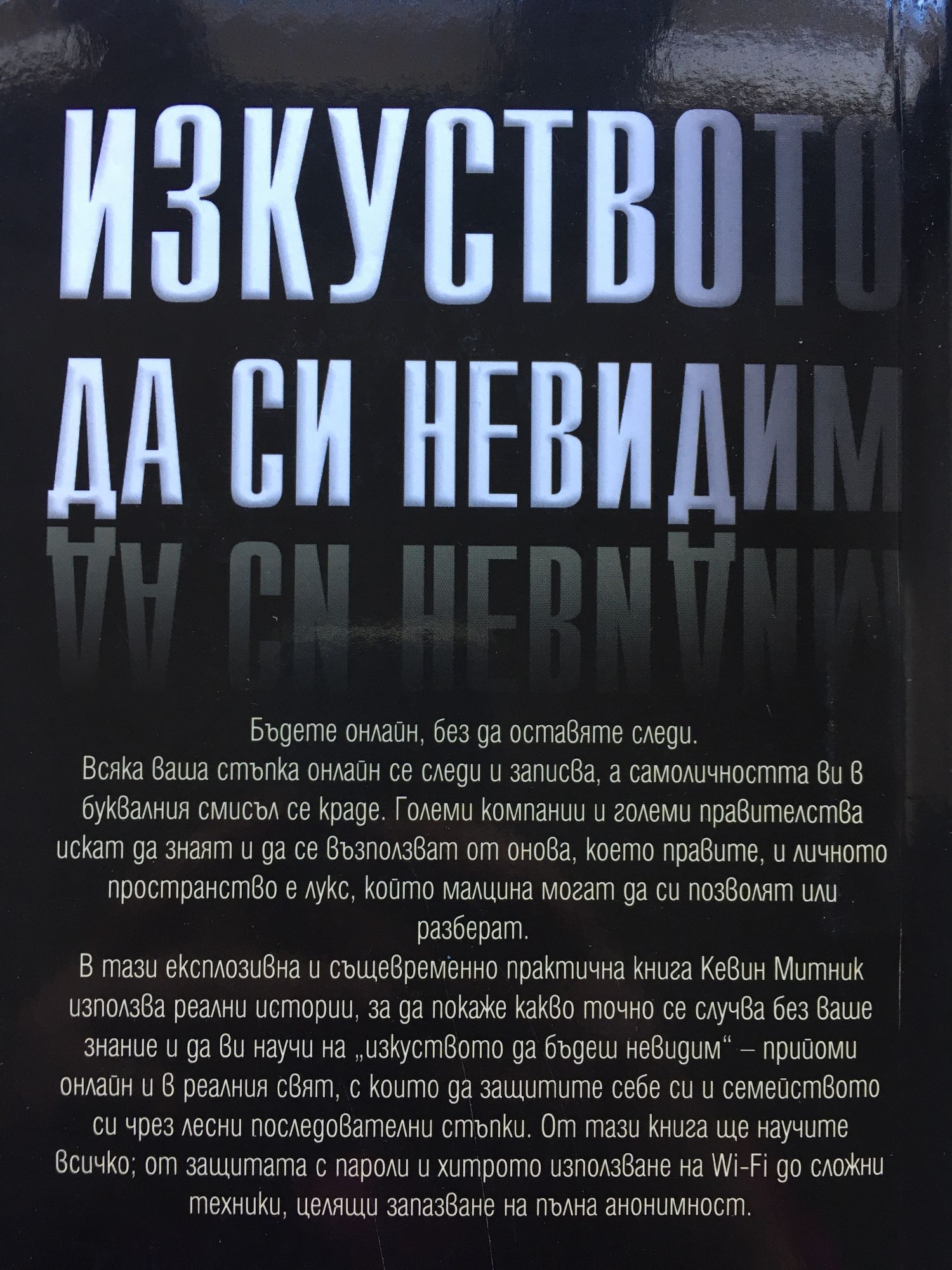 Бъдете онлайн, без да оставяте следи. Всяка ваша стъпка онлайн се следи и записва, а самоличността ви в буквалния смисъл се краде. Големи компании и големи правителства искат да знаят и да се възползват от онова, което правите, и личното пространство е лукс, който малцина могат да си позволят или разберат. В тази експлозивна и същевременно практична книга Кевин Митник използва реални истории, за да покаже какво точно се случва без ваше знание и да ви научи на „изкуството да бъдеш невидим“ – прийоми онлайн и в реалния свят, с които да защитите себе си и семейството си чрез лесни последователни стъпки. От тази книга ще научите всичко; от защитата с пароли и хитрото използване на Wi-Fi до сложни техники, целящи запазване на пълна анонимност.