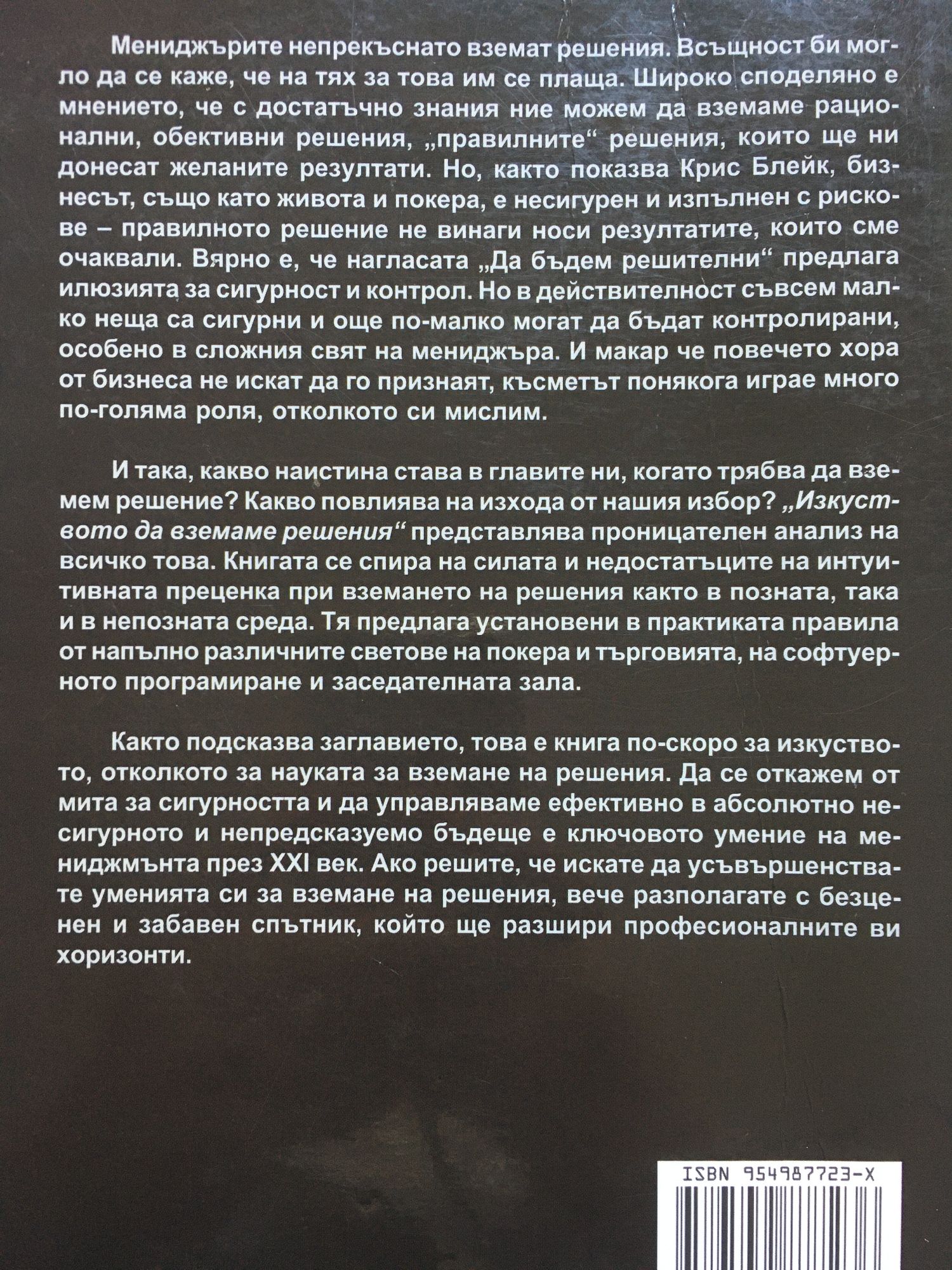 Мениджърите непрекъснато вземат решения. Всъщност би могло да се каже, че на тях за това им се плаща. Широко споделяно е мнението, че с достатъчно знания ние можем да вземаме рационални, обективни решения, „правилните" решения, които ще ни донесат желаните резултати. Но, както показва Крис Блейк, бизнесът, също като живота и покера, е несигурен и изпълнен с рискове - правилното решение не винаги носи резултатите, които сме очаквали. Вярно е, че нагласата „Да бъдем решителни" предлага илюзията за сигурност и контрол. Но в действителност съвсем малко неща са сигурни и още по-малко могат да бъдат контролирани, особено в сложния свят на мениджъра. И макар че повечето хора от бизнеса не искат да го признаят, късметът понякога играе много по-голяма роля, отколкото си мислим. И така, какво наистина става в главите ни, когато трябва да вземем решение? Какво повлиява на изхода от нашия избор? „Изкуството да вземаме решения" представлява проницателен анализ на всичко това. Книгата се спира на силата и недостатъците на интуитивната преценка при вземането на решения както в позната, така и в непозната среда. Тя предлага установени в практиката правила от напълно различните светове на покера и търговията, на софтуерното програмиране и заседателната зала. Както подсказва заглавието, това е книга по-скоро за изкуството, отколкото за науката за вземане на решения. Да се откажем от мита за сигурността и да управляваме ефективно в абсолютно несигурното и непредсказуемо бъдеще е ключовото умение на мениджмънта през XXI век. Ако решите, че искате да усъвършенствате уменията си за вземане на решения, вече разполагате с безценен и забавен спътник, който ще разшири професионалните ви хоризонти.
