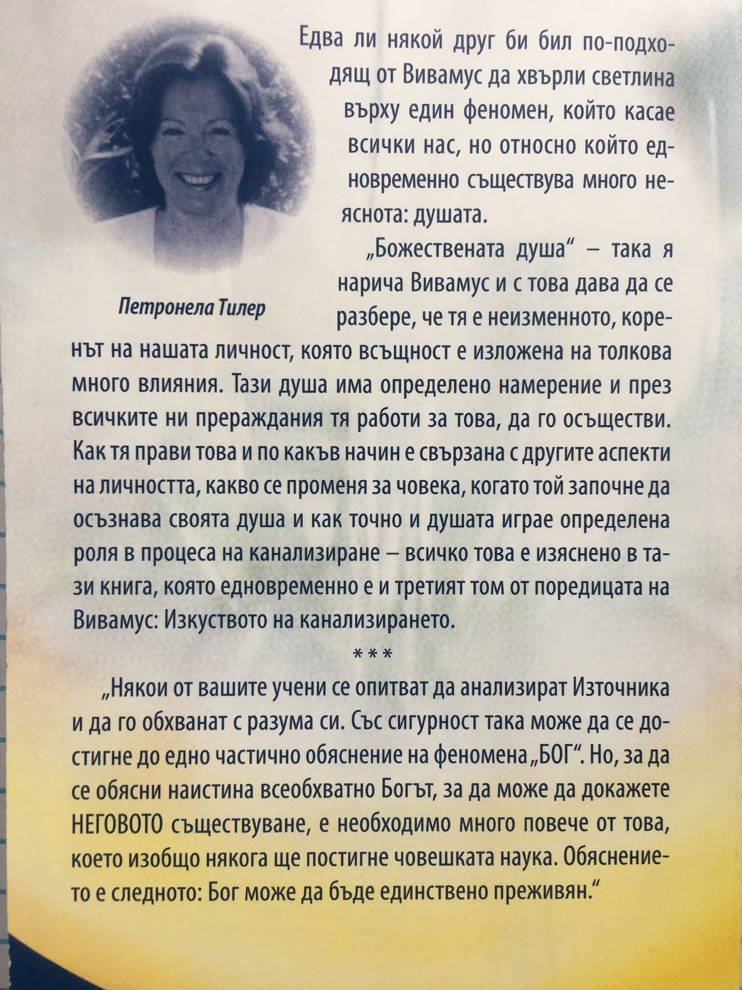 "Едва ли някой друг би бил по-подходящ от Вивамус да хвърли светлина върху един феномен, който касае всички нас, но относно който едновременно съществува много неяснота: душата. "Божествена душа" - така я нарича Вивамус и с това дава да се разбере, че тя е неизменното, коренът на нашата личност, която всъщност е изложена на толкова много влияния. Тази душа има определено намерение и през всичките ни прераждания тя работи за това, да го осъществи. Как тя прави това и по какъв начин е свързана с другите аспекти на личността, какво се променя за човека, когато той започне да осъзнава своята душа и как точно и душата играе определена роля в процеса на канализиране - всичко това е изяснено в тази книга, която едновременно е и третият том от поредицата на Вивамус "Изкуството на канализирането".