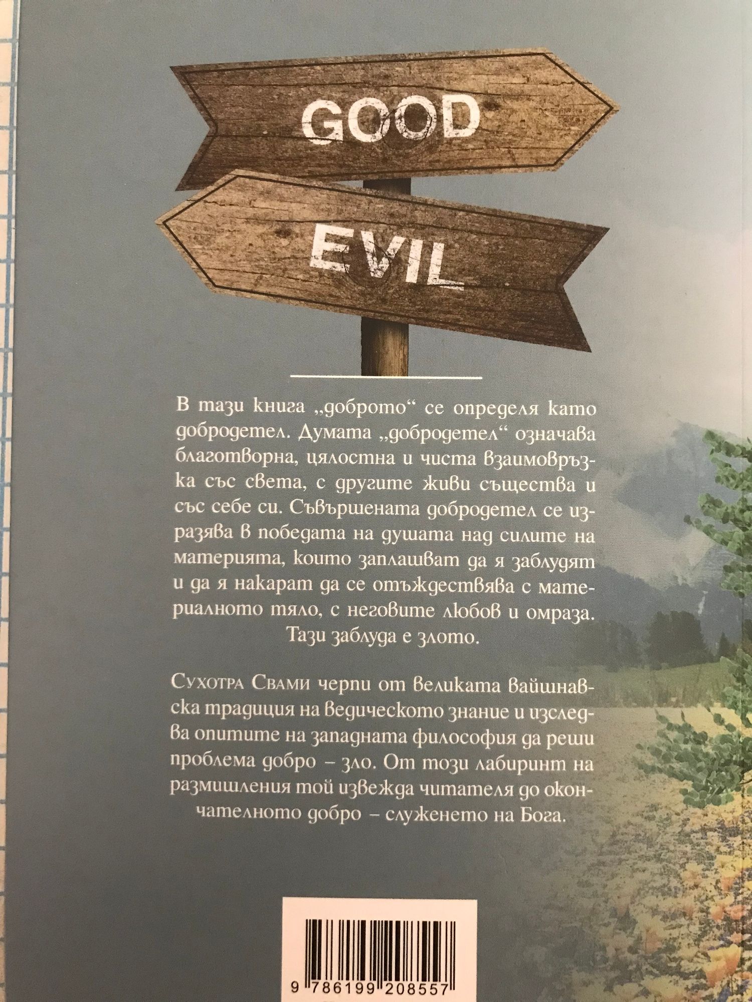 В тази книга "доброто" се определя като добродетел. Думата "добродетел" означава благотворна, цялостна и чиста взаимовръзка със света, с другите живи същества и със себе си. Съвършената добродетел се изразява в победата на душата над силите на материята, които заплашват да я заблудят и да я накарат да се отъждествява с материалното тяло, с неговите любов и омраза. Тази заблуда е злото. Авторът, Сухотра Свами, черпи от великата Ваишнава традиция на ведическото знание и изследва опитите на западната философия да реши проблема добро - зло. От този лабиринт на размишления той извежда читателя до окончателното добро - служенето на Бога.