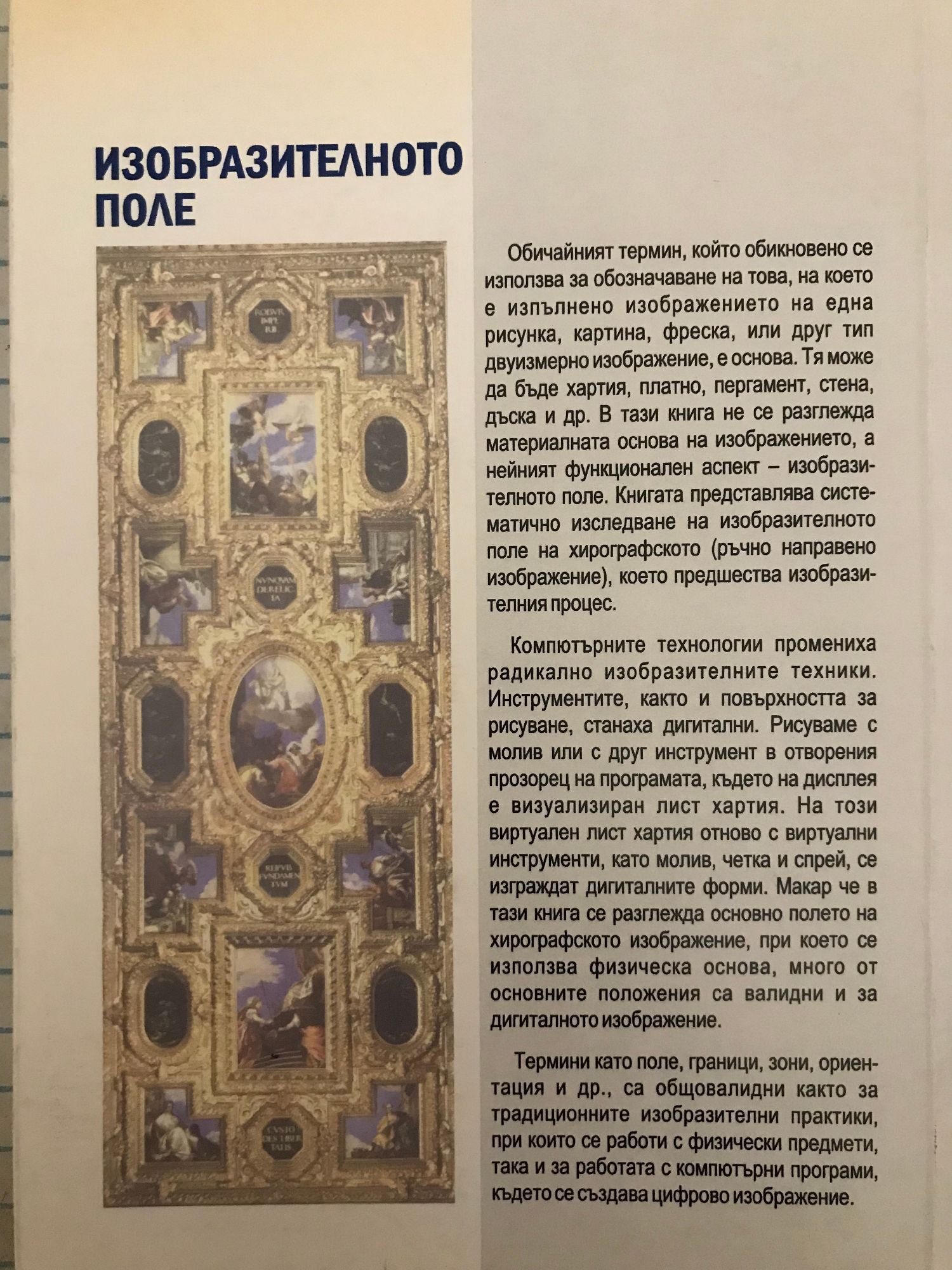 Обичайният термин, който обикновено се използва за обозначаване на това, на което е изпълнено изображението на една рисунка, картина, фреска, или друг тип двуизмерно изображение, е основа. Тя може да бъде хартия, платно, пергамент, стена, дъска и др. В тази книга не се разглежда материалната основа на изображението, а нейният функционален аспект - изобразителното поле. Книгата представлява систематично изследване на изобразителното поле на хирографското (ръчно направено изображение), което предшества изобразителния процес. Компютърните технологии промениха радикално изобразителните техники. Инструментите, както и повърхността за рисуване, станаха дигитални. Рисуваме с молив или с друг инструмент в отворения прозорец на програмата, където на дисплея е визуализиран лист хартия. На този виртуален лист хартия отново с виртуални инструменти, като молив, четка и спрей, се изграждат дигиталните форми. Макар че в тази книга се разглежда основно полето на хирографското изображение, при което се използва физическа основа, много от основните положения са валидни и за дигиталното изображение. Термини като поле, граници, зони, ориентация и др., са общовалидни както за традиционните изобразителни практики, при които се работи с физически предмети, така и за работата с компютър програми, където се създава цифрово изображение.