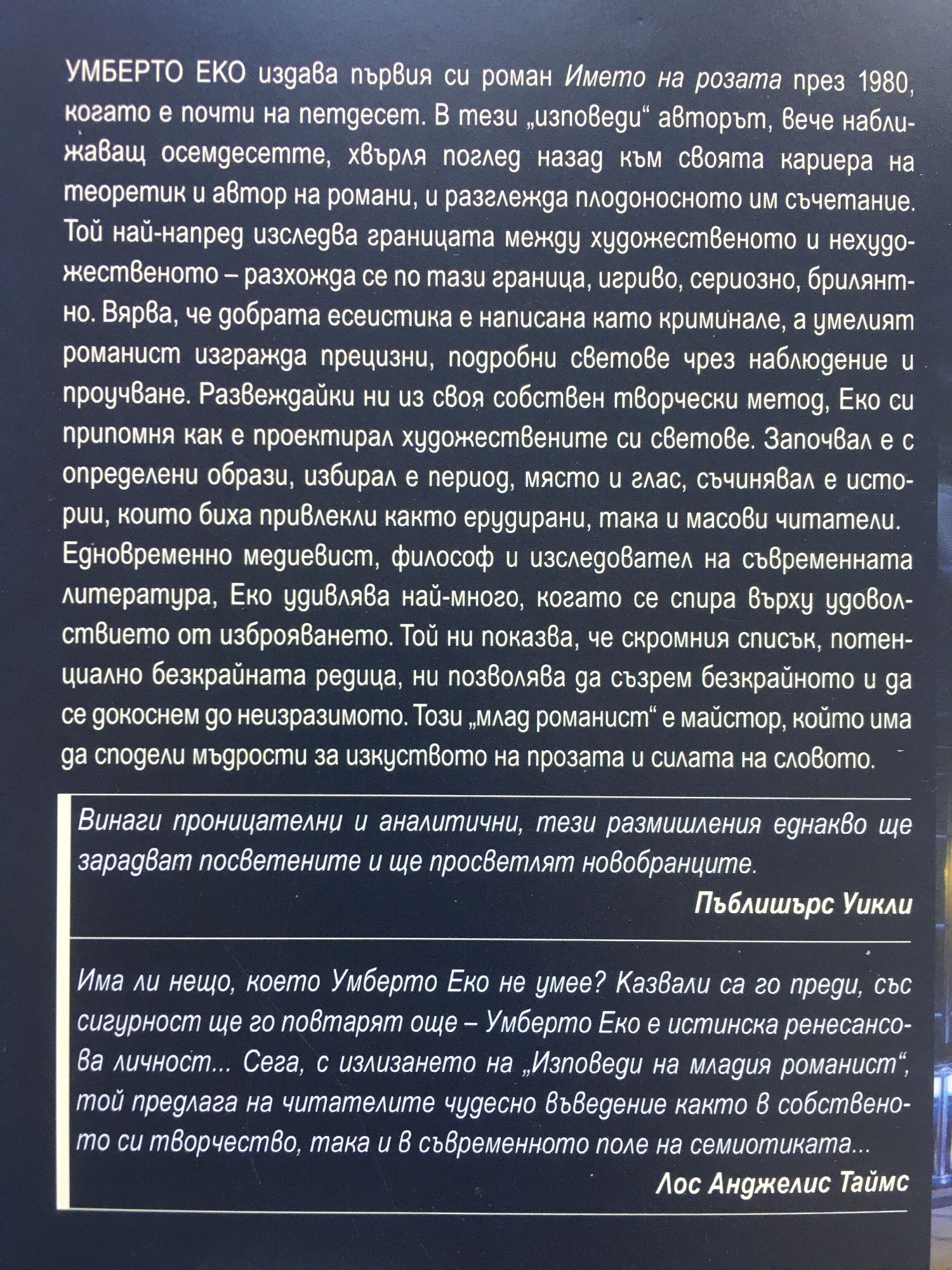 УМмбето Еко издава първия си роман "Името на розата" през 1980, когато е почти на петдесет. В тези „изповеди" авторът, вече наближаващ осемдесетте, хвърля поглед назад към своята кариера на теоретик и автор на романи, и разглежда плодоносното им съчетание. Той най-напред изследва границата между художественото и нехудожественото - разхожда се по тази граница, игриво, сериозно, брилянтно. Вярва, че добрата есеистика е написана като криминале, а умелият романист изгражда прецизни, подробни светове чрез наблюдение и проучване. Развеждайки ни из своя собствен творчески метод, Еко си припомня как е проектирал художествените си светове. Започвал е с определени образи, избирал е период, място и глас, съчинявал е истории, които биха привлекли както ерудирани, така и масови читатели. Едновременно медиевист, философ и изследовател на съвременната литература, Еко удивлява най-много, когато се спира върху удоволствието от изброяването. Той ни показва, че скромния списък, потенциално безкрайната редица, ни позволява да съзрем безкрайното и да се докоснем до неизразимото. Този „млад романист" е майстор, който има да сподели мъдрости за изкуството на прозата и силата на словото. "Винаги проницателни и аналитични, тези размишления еднакво ще зарадват посветените и ще просветлят новобранците." Пъблишърс Уикли "Има ли нещо, което Умберто Еко не умее? Казвали са го преди, със сигурност ще го повтарят още - Умберто Еко е истинска ренесансова личност... Сега, с излизането на „Изповеди на младия романист", той предлага на читателите чудесно въведение както в собственото си творчество, така и в съвременното поле на семиотиката..." Лос Анджелис Таймс