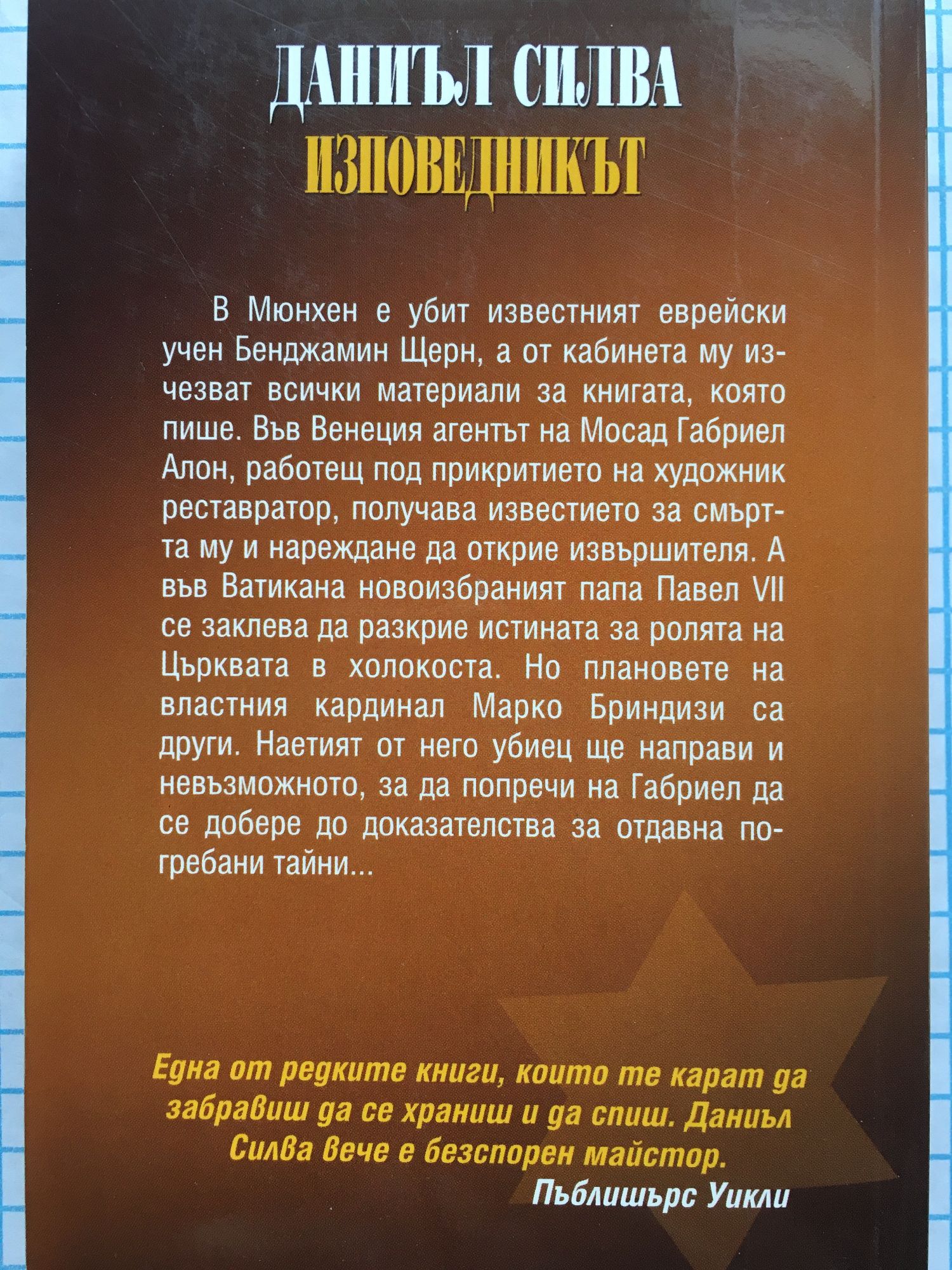 Сензационен трилър за дълбоко погребаните тайни на Ватикана. В Мюнхен е убит известният еврейски учен Щерн, а от кабинета му изчезват всички материали по книгата, която пише. Във Венеция агентът на Мосад Габриел Алон, работещ под прикритието на художник реставратор, получава известието за смъртта му и нареждане да открие извършителя. А във Ватикана новоизбраният папа се заклева да разкрие истината за ролята на Църквата в холокоста. Но плановете на властния кардинал Бриндизи са други. Наетият от него убиец ще направи и невъзможното, за да попречи на Габриел да се добере до доказателства за отдавна погребани тайни…
