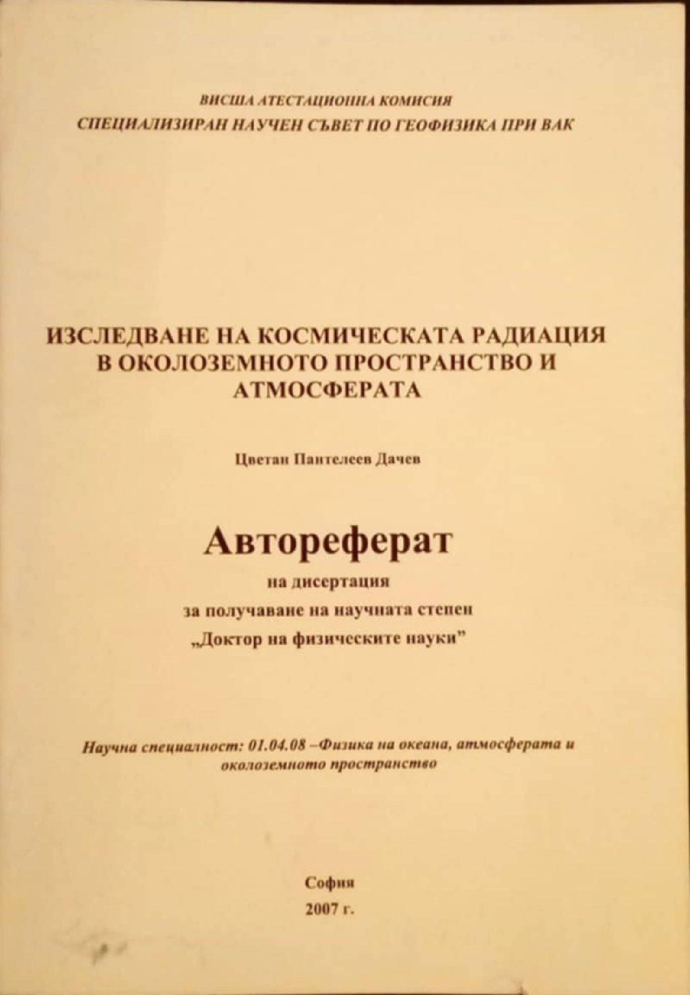 Автореферат на дисертация за получаване на научната степен "Доктор на физическите науки"