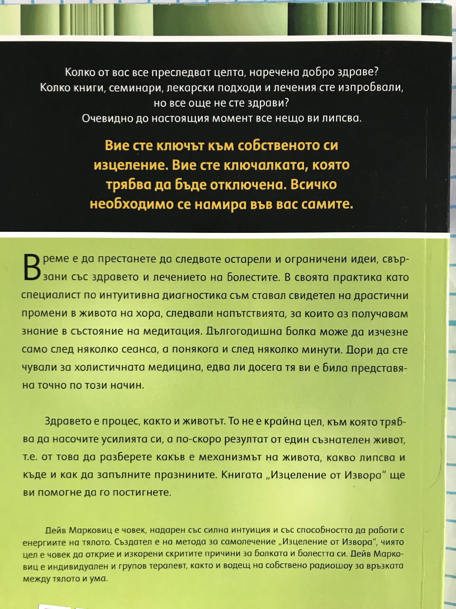 "Колко от вас все преследват целта, наречена добро здраве? Колко книги, семинари, лекарски подходи и лечения сте изпробвали, но все още не сте здрави? Очевидно до настоящия момент все нещо ви липсва. Време е да престанете да следвате остарели и ограничени идеи, свързани със здравето и лечението на болестите. В своята практика като специалист по интуитивна диагностика съм ставал свидетел на драстични промени в живота на хора, следвали напътствията, за които аз получавам знание в състояние на медитация. Дългогодишна болка може да изчезне само след няколко сеанса, а понякога и след няколко минути. Дори да сте чували за холистичната медицина, едва ли досега тя ви е била представяна точно по този начин. Здравето е процес, както и животът. То не е крайна цел, към която трябва да насочите усилията си, а по-скоро резултат от един съзнателен живот, т.е. от това да разберете какъв е механизмът на живота, какво липсва и къде и как да запълните празнините. Книгата "Изцеление от Извора" ще ви помогне да го постигнете."
