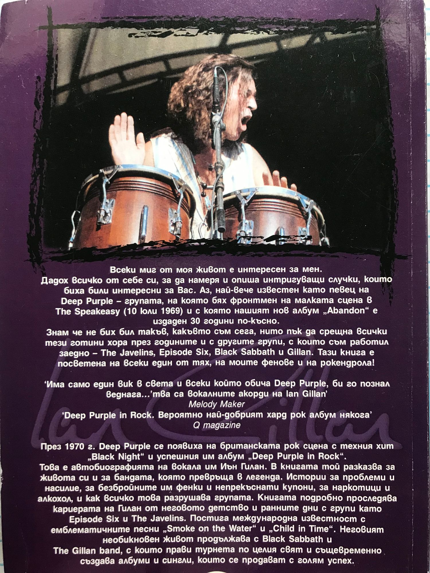 Всеки миг от моя живот е интересен за мен. Дадох всичко от себе си, за да намеря и опиша интригуващи случки, които биха били интересни за вас. Аз, най-вече известен като певец на Deep Purple - групата, на която бях фронтмен на малката сцена в The Speakeasy (10 (оли 1969) и с която нашият нов албум "Abandon" е издаден 30 години по-късно. Иън Гилан Това е автобиографията на Иън Гилан. В книгата той разказва за живота си и за бандата, която превръща в легенда. Истории за проблеми и насилие, за безбройните им фенки и непрекъснати купони, за наркотици и алкохол, и как всичко това разрушава групата. Книгата подробно проследява кариерата на Гилан от неговото детство и ранните дни с групи като Episode six и The Javelins. Постига международна известност с емблематичните песни "Smoke on the Water" и "Child in Time". Неговият необикновен живот продължава с Black Sabbath и The Gilan band, с които прави турнета по целия свят и същевременно създава албуми и сингли, които се продават с голям успех.