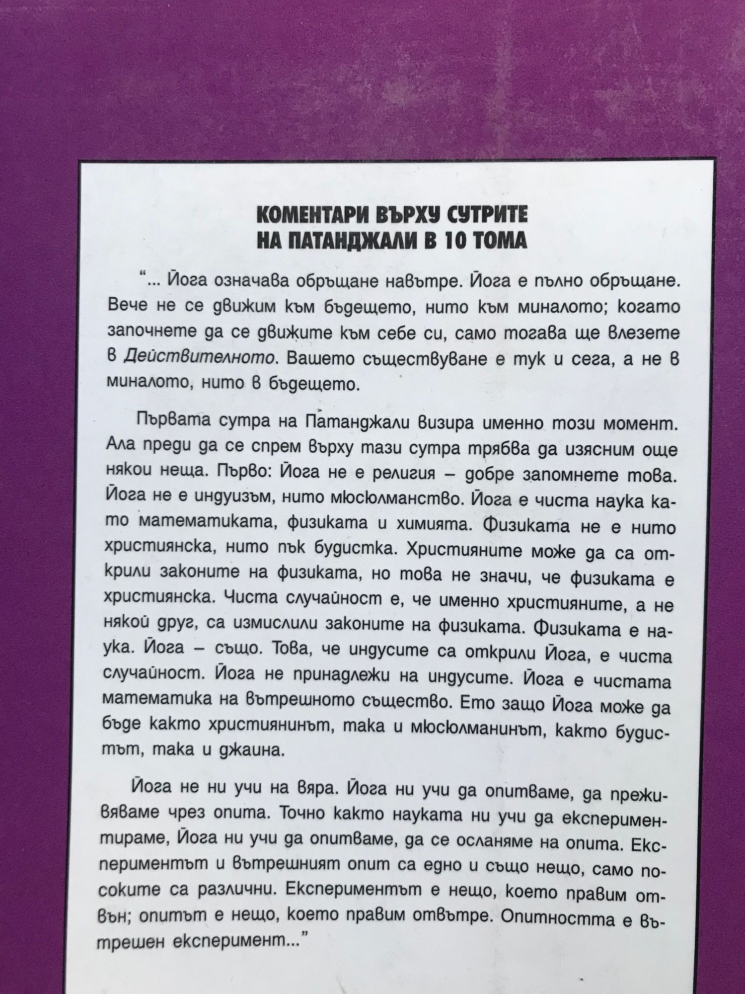 "Йога не ни учи на вяра. Йога ни учи да опитваме, да преживяваме чрез опита. Точно както науката ни учи да експериментираме, Йога ни учи да опитваме, да се осланяме на опита. Експериментът и вътрешният опит са едно и също нещо, само посоките са различни. Експериментът е нещо, което правим отвън; опитът е нещо, което правим отвътре. Опитността е вътрешен експеримент..."