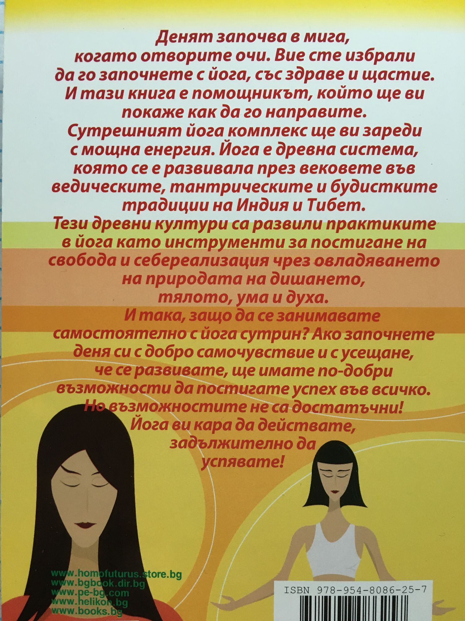 Денят започва в мига, когато отворите очи. Вие сте избрали да го започнете с йога, със здраве и щастие. И тази книга е помощникът, който ще ви покаже как да го направите. Сутрешният йога комплекс ще ви зареди с мощна енергия. Йога е древна система, която се е развивала през вековете във ведическите, тантрическите и будистките традиции на Индия и Тибет. И така, защо да се занимавате самостоятелно с йога сутрин? Ако започнете деня си с добро самочувствие и усещане, че се развивате, ще имате по-добри възможности да постигате успех във всичко. Но възможностите не са достатъчни! Йога ви кара да действате, задължително да успявате!