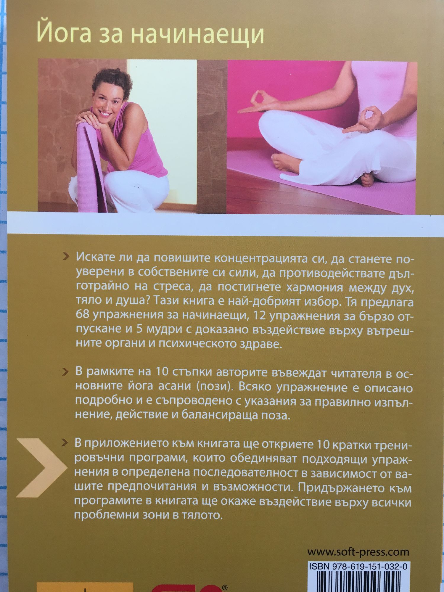 Искате ли да повишите концентрацията си, да станете по-уверени в собствените си сили, да противодействате дълготрайно на стреса, да постигнете хармония между дух, тяло и душа? Тази книга е най-добрият избор. Тя предлага 68 упражнения за бързо отпускане и 5 мудри с доказано въздействие върху вътрешните органи и психическото здраве. В рамките на 10 стъпки авторите въвеждат читателя в основните йога асани /пози/. Всяко упражнение е описано подробно и е съпроводено с указания за правилно изпълнение, действие и балансираща поза. В приложението към книгата ще откриете 10 кратки тренировъчни програми, които обединяват подходящи упражнения в определена последователност в зависимост от вашите предпочитания и възможности. Придържането към програмите в книгата ще окаже въздействие върху всички проблемни зони в тялото.