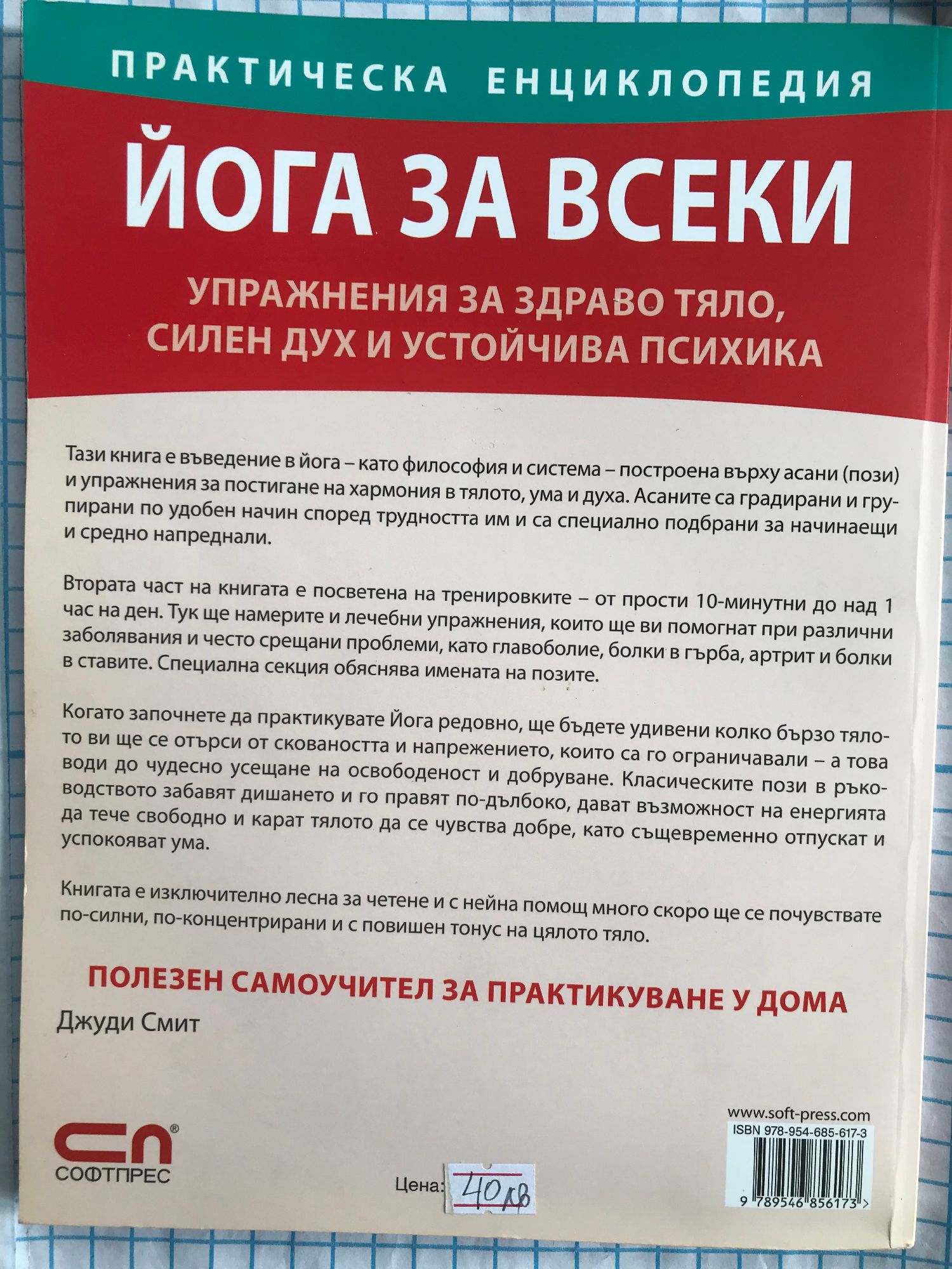 * Богато илюстриран справочник с над 400 цветни фотографии, показващи всяка поза стъпка по стъпка * Ръководството е одобрено от световноизвестния йога-гуру Б.К.С. Айенгар Тази книга е въведение в йога – като философия и система – построена върху асани (пози) и упражнения за постигане на хармония в тялото, ума и духа. Асаните са градирани и групирани по удобен начин според трудността им и са специално подбрани за начинаещи и средно напреднали. Втората част на книгата е посветена на тренировките – от прости 10-минутни до над 1 час на ден. Тук ще намерите и лечебни упражнения, които ще ви помогнат при различни заболявания и често срещани проблеми, като главоболие, болки в гърба, артрит и болки в ставите. Специална секция обяснява имената на позите. Когато започнете да практикувате Йога редовно, ще бъдете удивени колко бързо тялото ви ще се отърси от сковаността и напрежението, които са го ограничавали – а това води до чудесно усещане на освободеност и добруване. Класическите пози в ръководството забавят дишането и го правят по-дълбоко, дават възможност на енергията да тече свободно и карат тялото да се чувства добре, като същевременно отпускат и успокояват ума. Книгата е изключително лесна за четене и с нейна помощ много скоро ще се почувствате по-силни, по-концентрирани и с повишен тонус на цялото тяло.