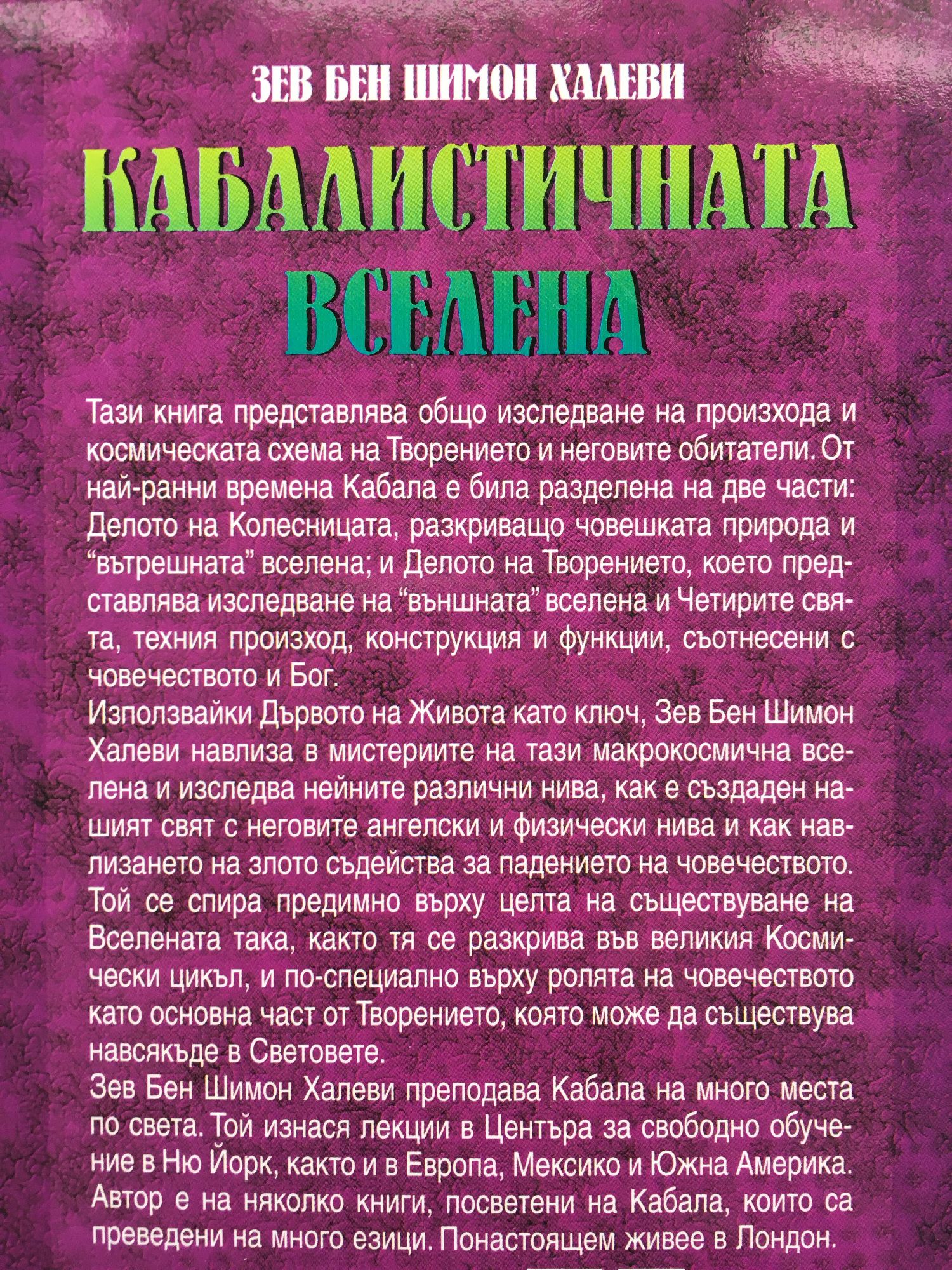 Тази книга представлява общо изследване на произхода и космическата схема на Творението и неговите обитатели. От най-ранни времена Кабала е била разделена на две части: Делото на Колесницата, разкриващо човешката природа и "вътрешната" вселена; и Делото на Творението, което представлява изследване на "външната" вселена и Четирите свята, техния произход, конструкция и функции, съотнесени с човечеството и Бог. Използвайки Дървото на Живота като ключ, Зев Бен Шимон Халеви навлиза в мистериите на тази макрокосмична вселена и изследва нейните различни нива, как е създаден нашият свят с неговите ангелски и физически нива и как навлизането на злото съдейства за падението на човечеството. Той се спира предимно върху целта на съществуване на Вселената така, както тя се разкрива във великия Космически цикъл, и по-специално върху ролята на човечеството като основна част от Творението, която може да съществува навсякъде в Световете. Зев Бен Шимон Халеви преподава Кабала на много места по света. Той изнася лекции в Центъра за свободно обучение в Ню Йорк, както и в Европа, Мексико и Южна Америка. Автор е на няколко книги, посветени на Кабала, които са преведени на много езици. Понастоящем живее в Лондон.