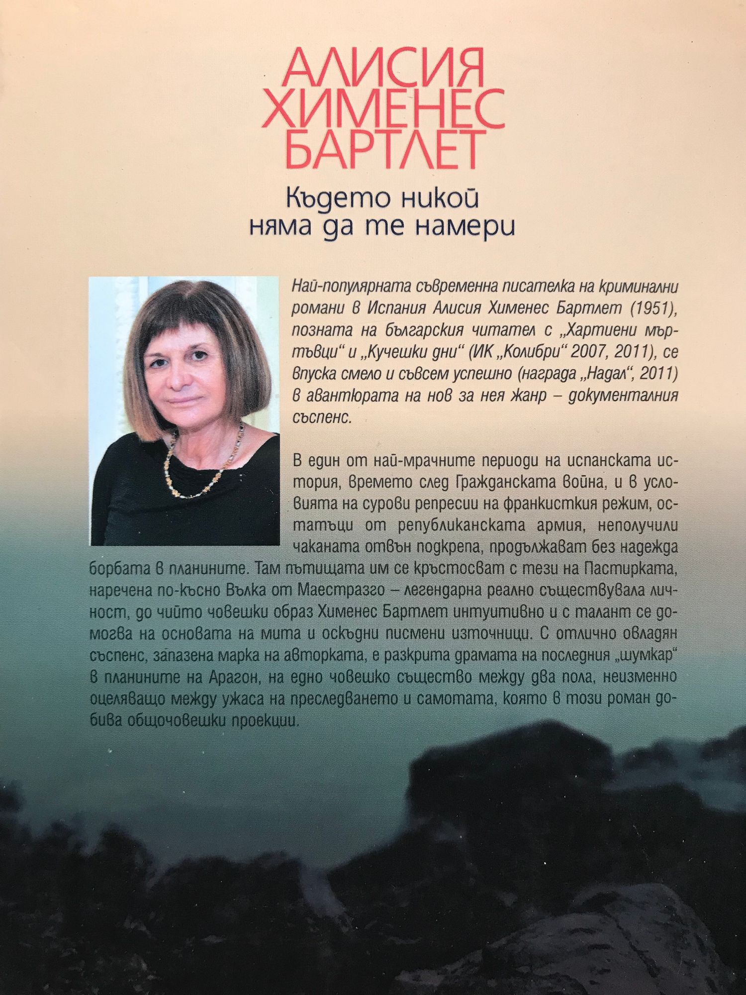 Най-популярната съвременна писателка на криминални романи в Испания Алисия Хименес Бартлет /1951/, позната на българския читател с "Хартиени мъртъвци" и "Кучешки дни", се впуска смело и съвсем успешно в авантюрата на нов за нея жанр - документалния съспенс. В един от най-мрачните периоди на испанската история, времето на Гражданската война, и в условията на сурови репресии на франкисткия режим, остатъци от републиканската армия, неполучили чаканата отвън подкрепа, продължават без надежда борбата в планините. Там пътищата им се кръстосват с тези на Пастирката, наречена по-късно Вълка от Маестразго - легендарна реално съществувала личност, до чийто човешки образ Хименес Бартлет интуитивно и с талант се домогва на основата на мита и оскъдни писмени източници. С отлично овладян съспенс, запазена марка на авторката, е разкрита драмата на последния "шумкар" в планините на Арагон, на едно човешко същество между два пола, неизменно оцеляващо между ужаса на преследването и самотата, която в този роман добива общочовешки проекции.