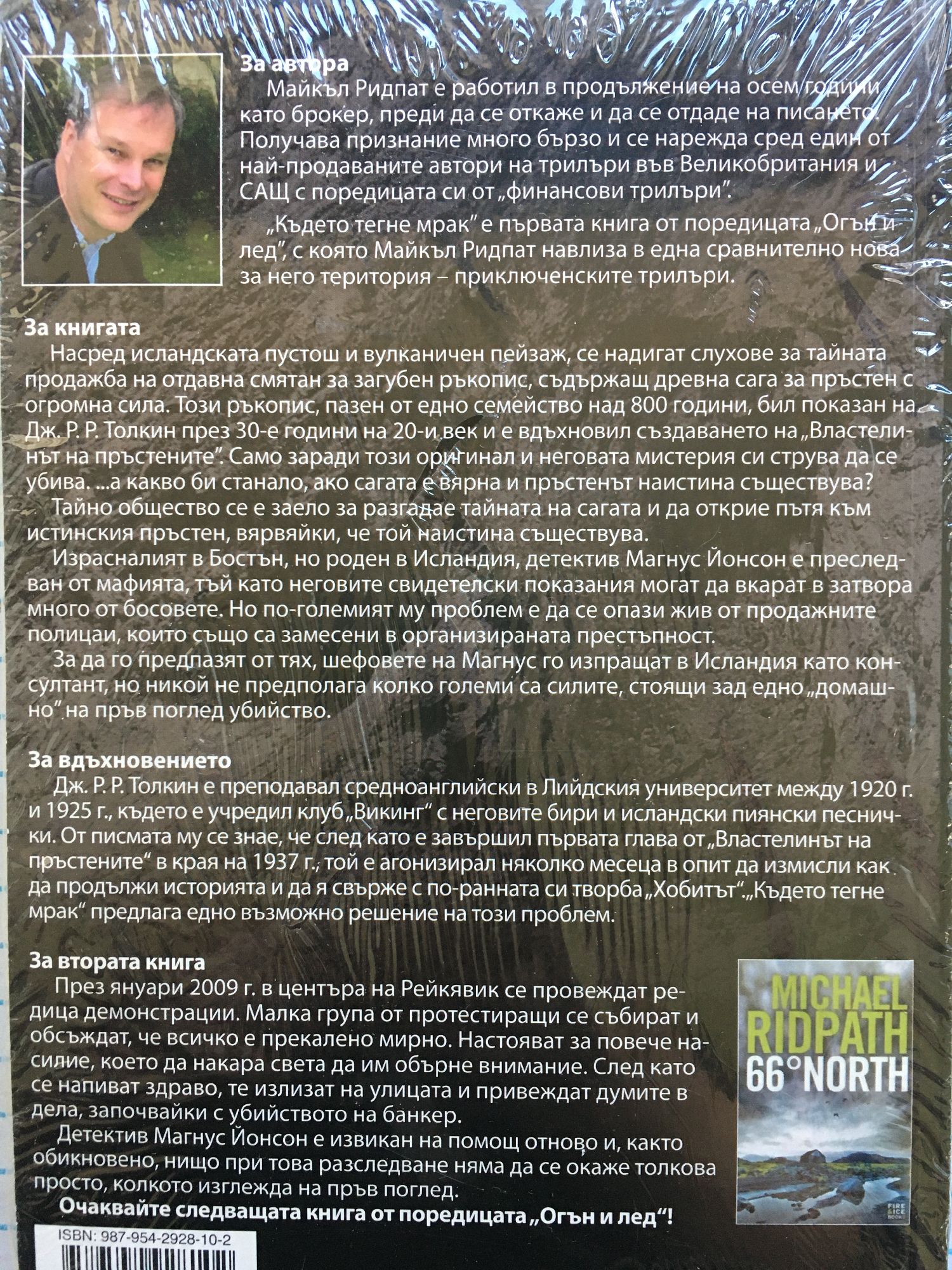 За автора Майкъл Ридпат е работил в продължение на осем години като брокер, преди да се откаже и да се отдаде на писането. Получава признание много бързо и се нарежда сред един от най-продаваните автори на трилъри във Великобритания и САЩ с поредицата си от „финансови трилъри". „Където тегне мрак" е първата книга от поредицата „Огън и лед", с която Майкъл Ридпат навлиза в една сравнително нова за него територия - приключенските трилъри. За книгата Насред исландската пустош и вулканичен пейзаж, се надигат слухове за тайната продажба на отдавна смятан за загубен ръкопис, съдържащ древна сага за пръстен с огромна сила. Този ръкопис, пазен от едно семейство над 800 години, бил показан на Дж. Р. Р. Толкин през 30-те години на 20-и век и е вдъхновил създаването на „Властелинът на пръстените". Само заради този оригинал и неговата мистерия си струва да се убива. ...а какво би станало, ако сагата е вярна и пръстенът наистина съществува? Тайно общество се е заело за разгадае тайната на сагата и да открие пътя към истинския пръстен, вярвайки, че той наистина съществува. Израсналият в Бостън, но роден в Исландия, детектив Магнус Йонсон е преследван от мафията, тъй като неговите свидетелски показания могат да вкарат в затвора много от босовете. Но по-големият му проблем е да се опази жив от продажните полицаи, които също са замесени в организираната престъпност. За да го предпазят от тях, шефовете на Магнус го изпращат в Исландия като консултант, но никой не предполага колко големи са силите, стоящи зад едно„домашно"на пръв поглед убийство. За вдъхновението Дж. Р. Р. Толкин е преподавал средноанглийски в Лийдския университет между 1920 г. и 1925 г, където е учредил клуб „Викинг" с неговите бири и исландски пиянски песнички. От писмата му се знае, че след като е завършил първата глава от „Властелинът на пръстените" в края на 1937 г., той е агонизирал няколко месеца в опит да измисли как да продължи историята и да я свърже с по-ранната си творба „Хобитът". „Където тегне мрак" предлага едно възможно решение на този проблем. За втората книга През януари 2009 г. в центъра на Рейкявик се провеждат редица демонстрации. Малка група от протестиращи се събират и обсъждат, че всичко е прекалено мирно. Настояват за повече насилие, което да накара света да им обърне внимание. След като се напиват здраво, те излизат на улицата и привеждат думите в дела, започвайки с убийството на банкер. Детектив Магнус Йонсон е извикан на помощ отново и, както обикновено, нищо при това разследване няма да се окаже толкова просто, колкото изглежда на пръв поглед. Очаквайте следващата книга от поредицата „Огън и лед"!