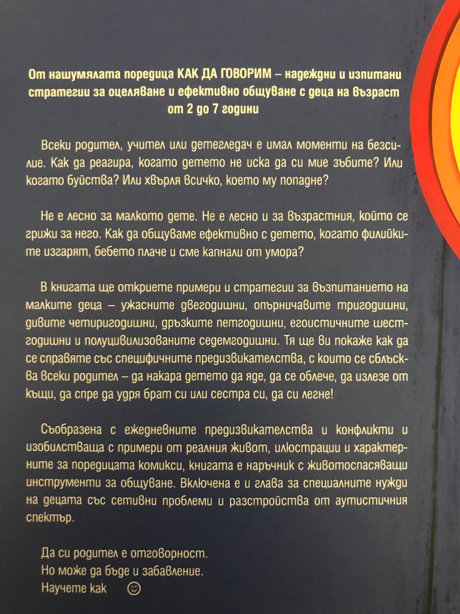 От нашумялата поредица КАК ДА ГОВОРИМ – надеждни и изпитани стратегии за оцеляване и ефективно общуване с деца на възраст от 2 до 7 години Всеки родител, учител или детегледач е имал моменти на безсилие. Как да реагира, когато детето не иска да си мие зъбите? Или когато буйства? Или хвърля всичко, което му попадне? Не е лесно за малкото дете. Не е лесно и за възрастния, който се грижи за него. Как да общуваме ефективно с детето, когато филийките изгарят, бебето плаче и сме капнали от умора? В книгата ще откриете примери и стратегии за възпитанието на малките деца – ужасните двегодишни, опърничавите тригодишни, дивите четиригодишни, дръзките петгодишни, егоистичните шестгодишни и полуцивилизованите седемгодишни. Тя ще ви покаже как да се справяте със специфичните предизвикателства, с които се сблъсква всеки родител – да накара детето да яде, да се облече, да излезе от къщи, да спре да удря брат си или сестра си, да си легне! Съобразена с ежедневните предизвикателства и конфликти и изобилстваща с примери от реалния живот, илюстрации и характерните за поредицата комикси, книгата е наръчник с животоспасяващи инструменти за общуване. Включена е и глава за специалните нужди на децата със сетивни проблеми и разстройства от аутистичния спектър. Да си родител е отговорност. Но може да бъде и забавление. Научете как :)