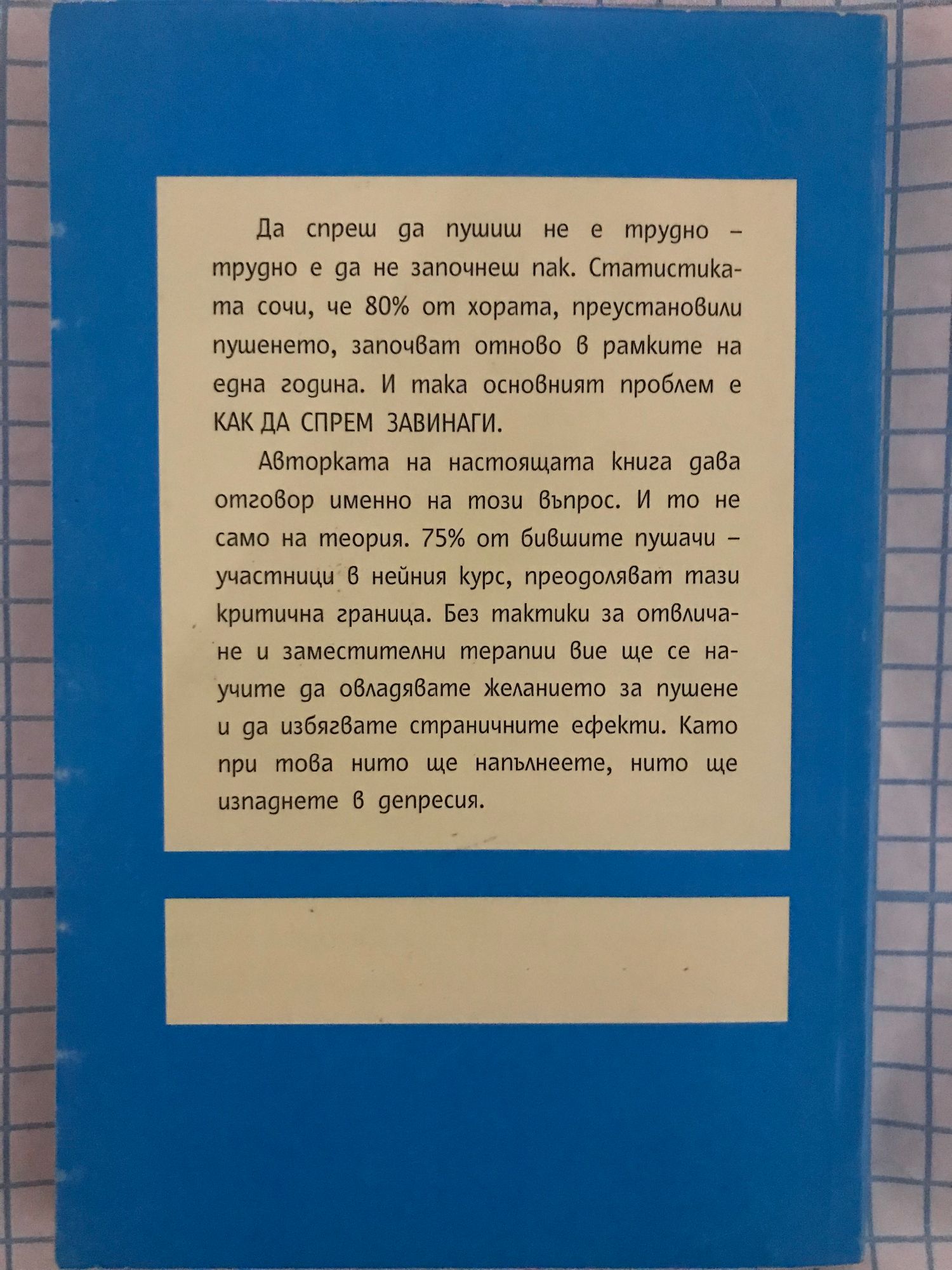 Да спреш да пушиш не е трудно - трудно е да не започнеш пак. Статистиката сочи, че 80% от хората, преустановили пушенето, започват отново в рамките на една година. И така основният проблем е как да спрем завинаги. Авторката на настоящата книга дава отговор именно на този въпрос. И то не само на теория. 75% от бившите пушачи - участници в нейния курс, преодоляват тази критична граница. Без тактики за отвличане и заместителни терапии вие ще се научите да овладеете желанието за пушене и да избягвате страничните ефекти. Като при това нито ще напълнеете, нито ще изпаднете в депресия.