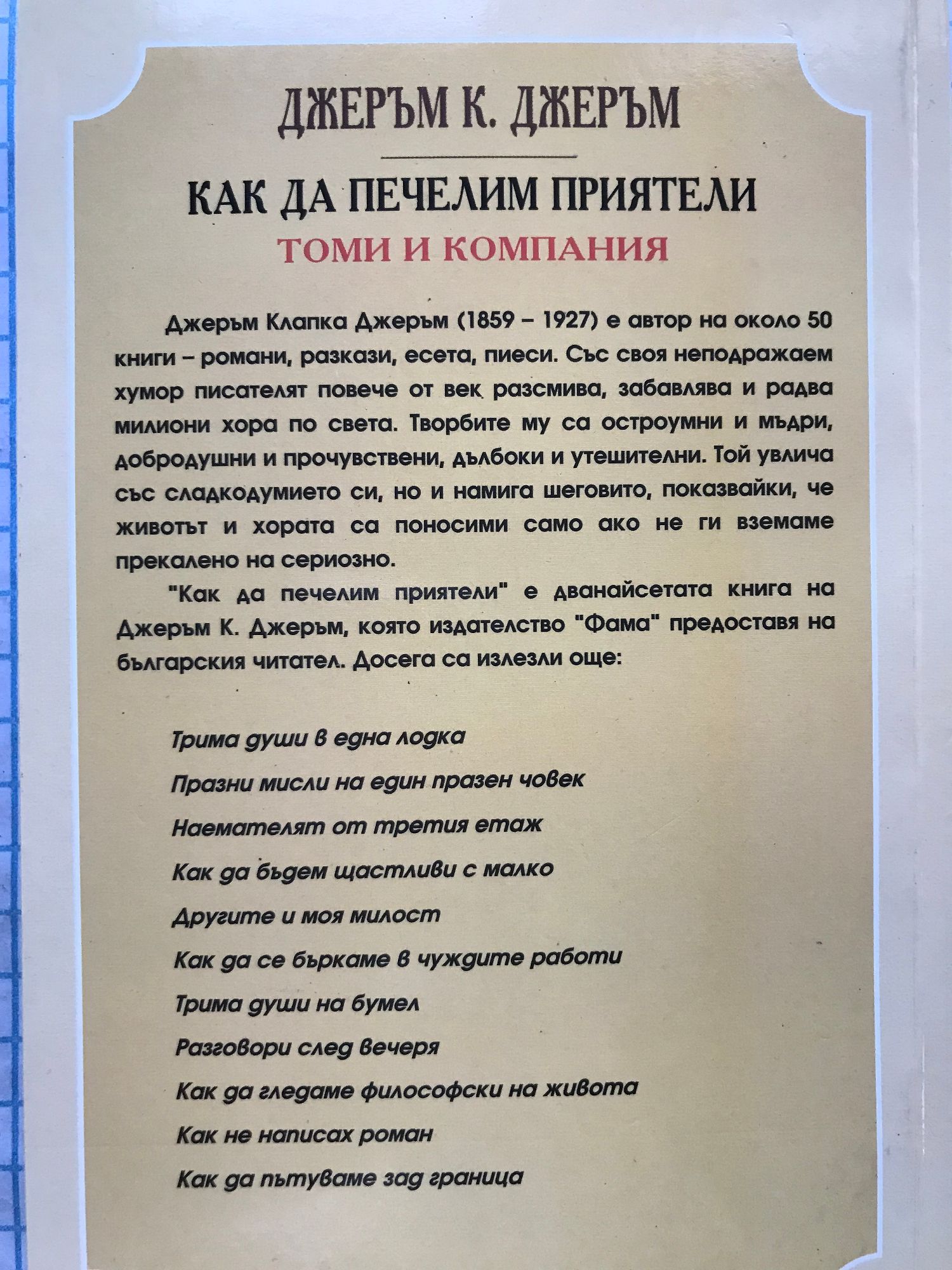 Джеръм Клапка Джеръм (1859-1927) е автор на около 50 книги - романи, разкази, есета, пиеси. Със своя неподражаем хумор писателят повече от век разсмива, забавлява и радва милиони хора по света. Творбите му са остроумни и мъдри, добродушни и прочувствени, дълбоки и утешителни. Той увлича със сладкодумието си, но и намига шеговито, показвайки, че животът и хората са поносими само ако не ги вземаме прекалено на сериозно.
