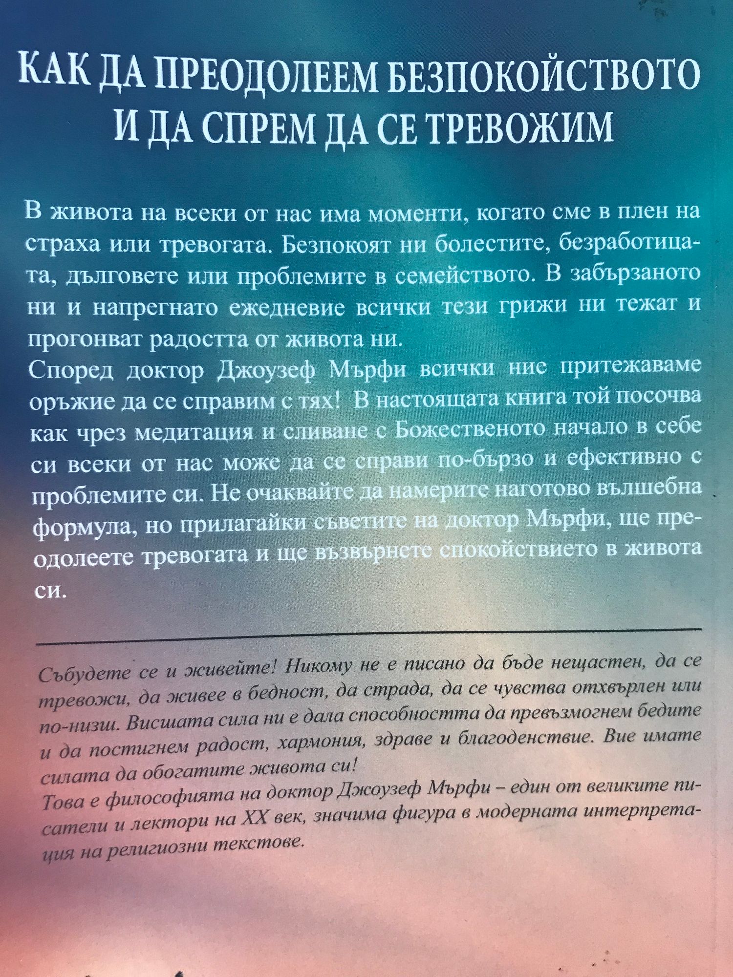 В живота на всеки от нас има моменти, когато сме в плен на страха или тревогата. Безпокоят ни болестите, безработицата, дълговете или проблемите в семейството. В забързаното ни и напрегнато ежедневие всички тези грижи ни тежат и прогонват радостта от живота ни. Според доктор Джоузеф Мърфи всички ние притежаваме оръжие да се справим с тях! В настоящата книга той посочва как чрез медитация и сливане с Божественото начало в себе си всеки от нас може да се справи по-бързо и ефективно с проблемите си. Не очаквайте да намерите наготово вълшебна формула, но прилагайки съветите на доктор Мърфи, ще преодолеете тревогата и ще възвърнете спокойствието в живота си. Събудете се и живейте! Никому не е писано да бъде нещастен, да се тревожи, да живее в бедност, да страда, да се чувства отхвърлен или по-низш. Висшата сила ни е дала способността да превъзмогнем бедите и да постигнем радост, хармония, здраве и благоденствие. Вие имате силата да обогатите живота си! Това e философията на доктор Джоузеф Мърфи – един от великите писатели и лектори на XX век, значима фигура в модерната интерпретация на религиозни текстове.