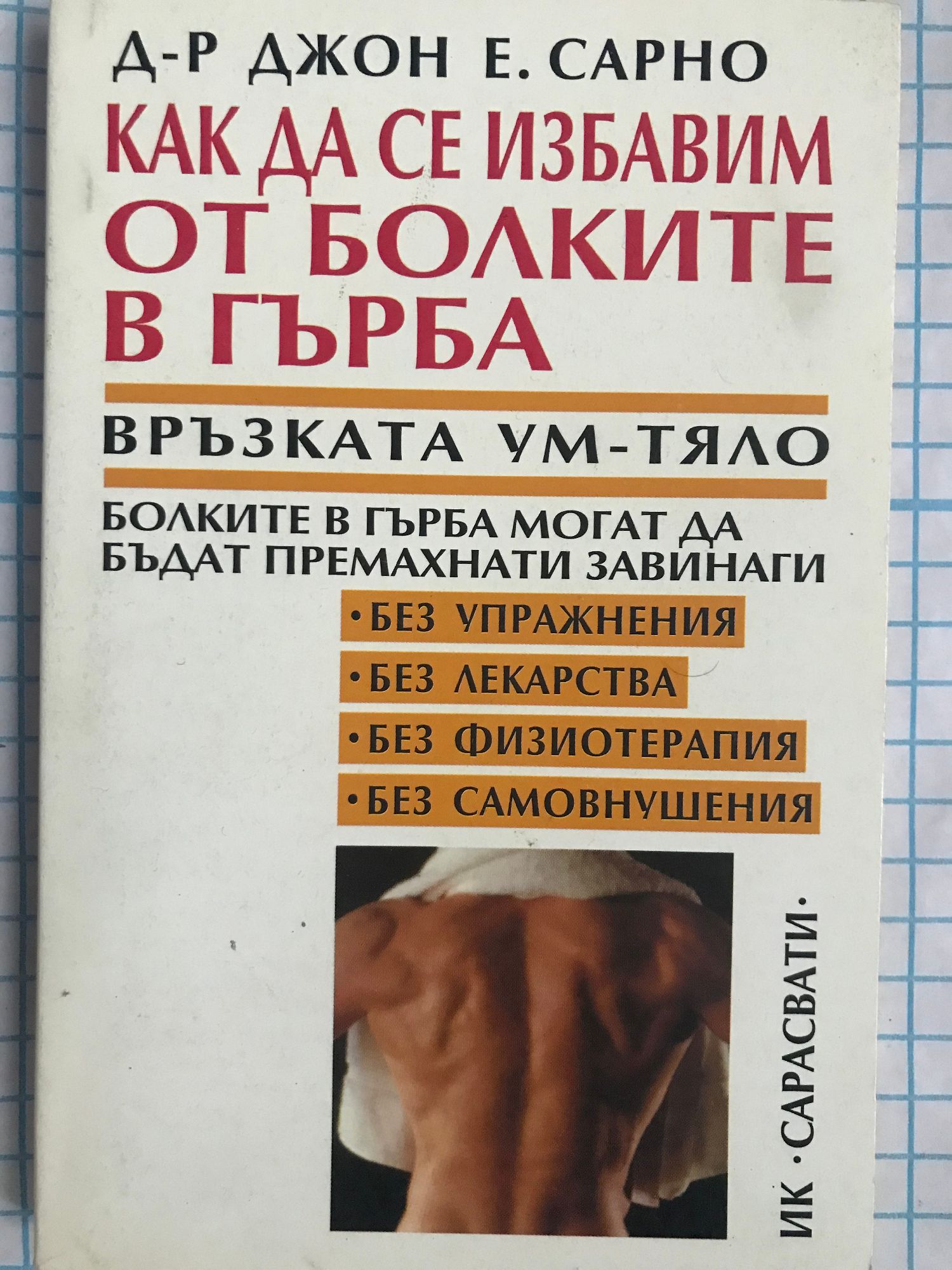 ТОРМОЗЯТ ЛИ ВИ БОЛКИ В ГЪРБА, РАМЕНЕТЕ ИЛИ ВРАТА? ПРЕЧАТ ЛИ ВИ ДА ЖИВЕЕТЕ ПЪЛНОЦЕННО? ПРИНУЖДАВАЛИ ЛИ СА ВИ ДА ОГРАНИЧИТЕ ФИЗИЧЕСКАТА СИ АКТИВНОСТ И ДА ПРОМЕНИТЕ НАЧИНА СИ НА ЖИВОТ? Ако е така, може би страдате от СНМ (Синдром на причинения от напрежение миозит) и не е необходимо повече да го търпите! Д-р Джон Е. Сарно е проправящ нови пътища в медицината лекар, чиято програма е помогнала на хиляди пациенти да превъзмогнат заболяванията на гърба им – без лекарства или опасна операция. Като използва най-последните изследвания за СНМ, д-р Сарно прави в тази книга още една стъпка напред: след като установява ролята на стреса и други психологически фактори при болките в гърба, той показва колко много от неговите пациенти са се излекували без упражнения или друга физикална терапия. Книгата ще ви помогне да разберете: • Защо амбициозните и успели хора са податливи на СНМ. • Как тревожността и потиснатият гняв причиняват мускулни спазми. • Как хората „сами се подготвят“ да изпитват болки в гърба. • Как можете да се избавите от болките в гърба след две до шест седмици чрез разпознаване на СНМ и на неговите причини. Като използва реални случаи и резултатите от задълбочени изследвания на връзката между мислите, емоциите и тялото, д-р Сарно описва как пациентите разпознават емоционалните корени на своя СНМ и прерязват връзките между психическата и физическата болка... И как, просто чрез четене на тази книга, вие може да започнете още днес да се възстановявате от болките в гърба.