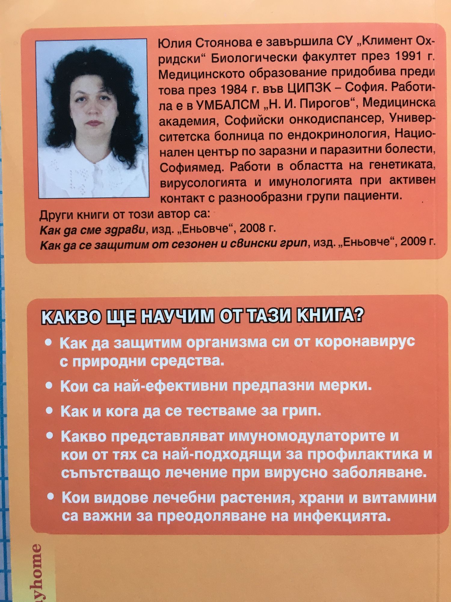 Какво ще научим от тази книга? • Как да защитим организма си от коронавирус с природни средства. • Кои са най-ефективни предпазни мерки. • Как и кога да се тестваме за грип. • Какво представляват имуномодулаторите и кои от тях са най-подходящи за профилактика и съпътстващо лечение при вирусно заболяване. • Кои видове лечебни растения, храни и витамини са важни за преодоляване на инфекцията. За автора Юлия Стоянова е завършила СУ „Климент Охридски“ Биологически факултет през 1991 г. Медицинското образование придобива преди това през 1984 г. във ЦИПЗК – София. Работила е в УМБАЛСМ „Н. И. Пирогов”, Медицинска академия, Софийски онкодиспансер, Университетска болница по ендокринология, Национален център по заразни и паразитни болести, Софиямед. Работи в областта на генетиката, вирусологията и имунологията при активен контакт с разнообразни групи пациенти.