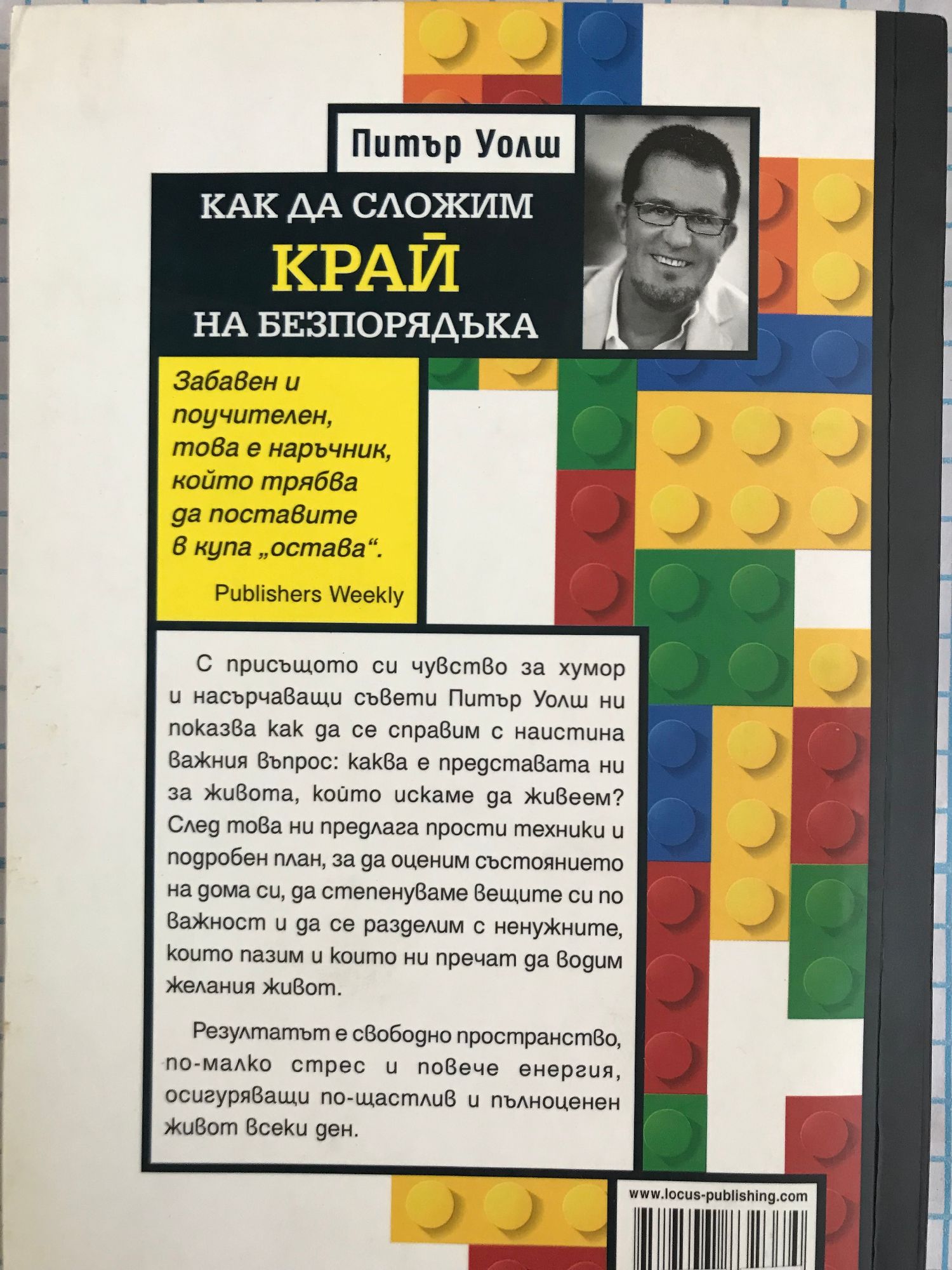 С присъщото си чувство за хумор и насърчаващи съвети, Питър Уолш ни показва как да се справим с наистина важния въпрос: каква е представата ни за живота, който искаме да живеем? След това ни предлага прости техники и подробен план, за да оценим състоянието на дома си, да степенуваме вещите си по важност и да се разделим с ненужните, които пазим и които ни пречат да водим желания живот. Резултатът е свободно пространство, по-малко стрес и повече енергия, осигуряващи по-щастлив и пълноценен живот всеки ден. Уникалният подход на Питър Уолш ни помага да се научим да се освобождаваме от емоционалния и психологичен безпорядък, който буквално и преносно изсмуква живота от домовете ни. "В най-новата си книга за управление на безпорядъка дългогодишният организационен консултант, телевизионен водещ и автор Уолш има повече идеи, отколкото са вехториите в резервния ви гардероб, и което е по-хубаво, тя е организирана, задълбочена и много лесна за ползване. Част първа разглежда "Проблемът с безпорядъка": откъде идва, как пречи и как да се справим с него без оправдания и обезсърчаване. Част втора представя подробен подход за "Разтребване на безпорядъка", който започва с "повърхностния безпорядък" и разработва семеен план, преди да пристъпи към основната част на книгата: разходка из всяка стая в къщата. Включени са писма, които Уолш е получавал от зрителите на предаването си по TLC "Пълна промяна", кратки разкази, илюстриращи как реални хора се справят с обичайните организационни предизвикателства, таблици, списъци и странични теми ("Тест за безпорядък", "Планиране на дворна разпродажба") за допълнително удобство. Уолш разглежда непосредствената задача като "позитивен и вълнуващ" начин да откриете "идеалния си дом" и да "намерите онези неща, които са най-важни в живота ви". Забавен и поучителен, това е наръчник, който читателите трябва да поставят в купа "остава". Publishers Weekly "Най-добрите организационни съвети, които някога сме чували!" Woman's Day Питър Уолш е организационен консултант. Медийните му изяви включват участия в "The Early Show" и "Fox News", както и публикации в "USA Today", "New York Times" и "Real Simple".