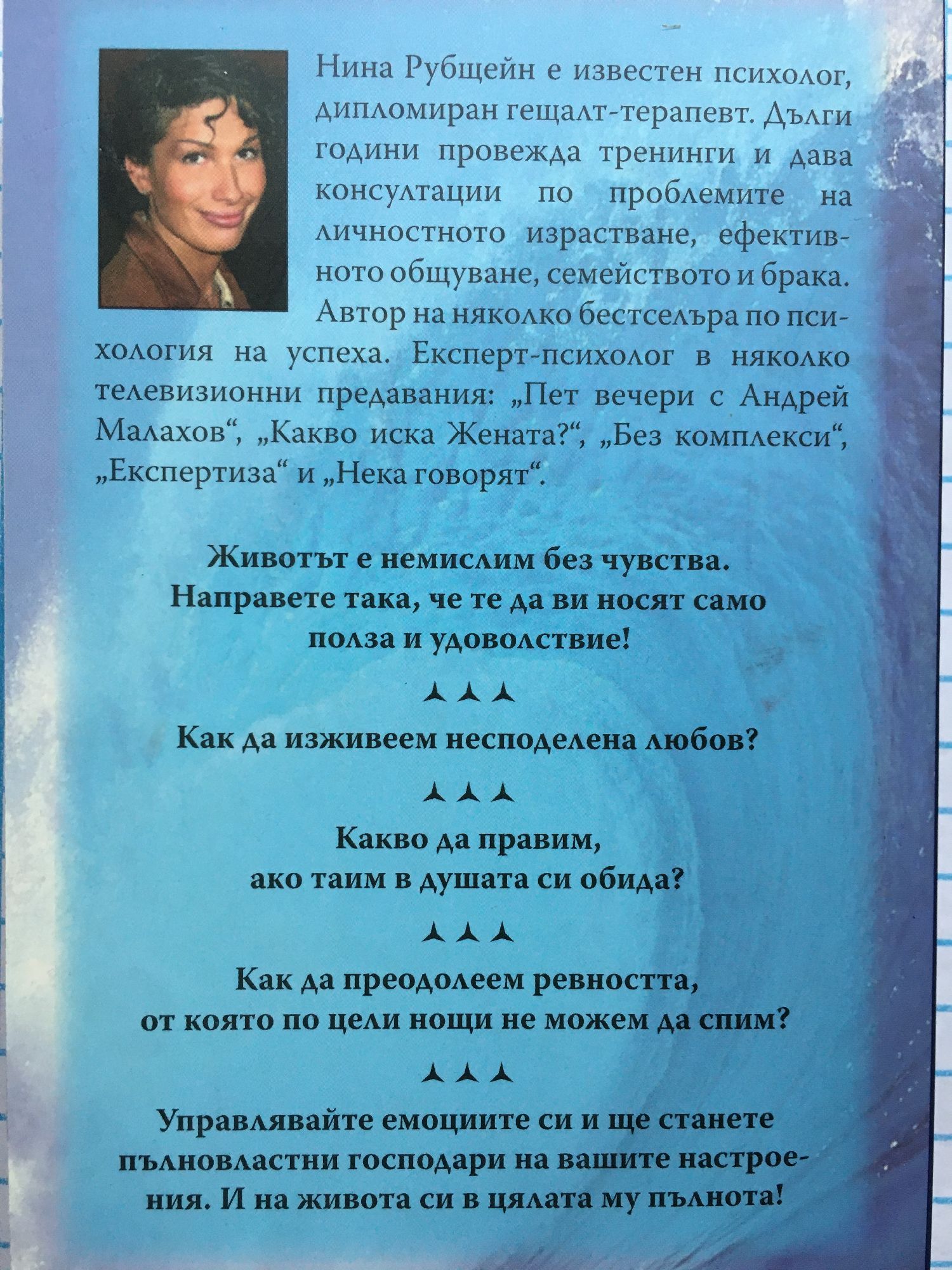 Животът е немислим без чувства. Направете така, че те да ви носят само полза и удоволствие! Как да изживеем несподелена любов? Какво да правим, ако таим в душата си обида? Как да преодолеем ревността, от която по цели нощи не можем да спим? Управлявайте емоциите си и ще станете пълновластни господари на вашите настроения. И на живота си в цялата му пълнота! Нина Рубщейн е известен психолог, дипломиран гещалт-терапевт. Дълги години провежда тренинги и дава консултации по проблемите на личностното израстване, ефективното общуване, семейството и брака. Автор на няколко бестселъра по психология на успеха. Експерт-психолог в няколко телевизионни предавания: „Пет вечери с Андрей Малахов“, „Какво иска Жената?“, „Без комплекси“, „Експертиза“ и „Нека говорят“.