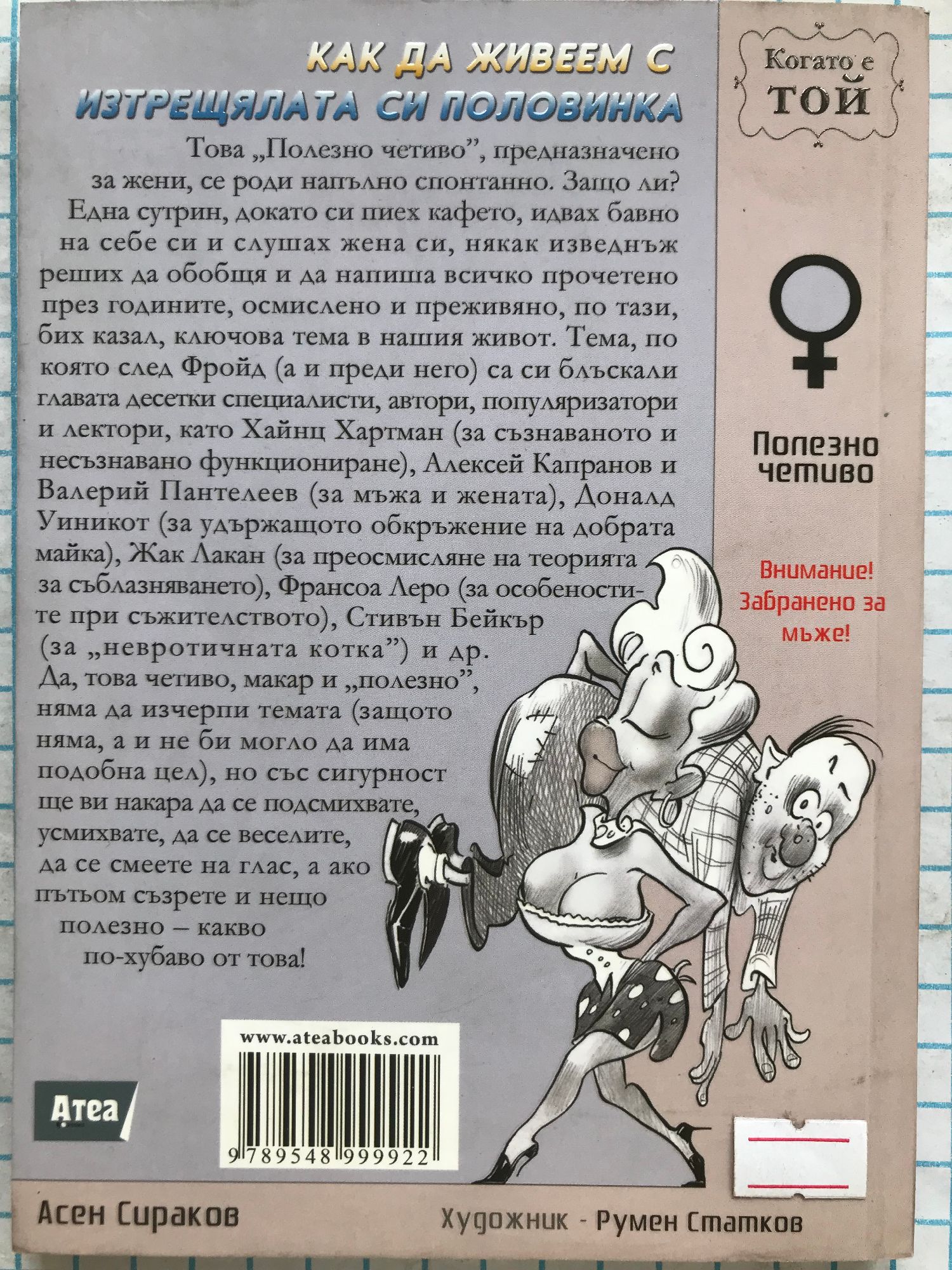 Това „Полезно четиво”, наречено „Как да живеем с изтрещялата си половинка” предназначено за жени, се роди напълно спонтанно. Защо ли? Eдна сутрин, докато си пиех кафето, идвах бавно на себе си и слушах жена си, някак изведнъж реших да обобщя и да напиша всичко прочетено през годините, осмислено и преживяно, по тази, бих казал, ключова тема в нашия живот. Тема, по която след Фройд (а и преди него) са си блъскали главата десетки специалисти, автори, популяризатори и лектори, като Хайнц Хартман (за съзнаваното и несъзнавано функциониране), Алексей Капранов и Валерий Пантелеев (за мъжа и жената), Доналд Уиникот (за удържащото обкръжение на добрата майка), Жак Лакан (за преосмисляне на теорията за съблазняването), Франсоа Леро (за особеностите при съжителството), Стивън Бейкър (за „невротичната котка”) и др. Да, това четиво, макар и „полезно”, няма да изчерпи темата (защото няма, а и не би могло да има подобна цел), но със сигурност ще ви накара да се подсмихвате, усмихвате, да се веселите, да се смеете на глас, а ако пътьом съзрете и нещо полезно – какво по-хубаво от това!