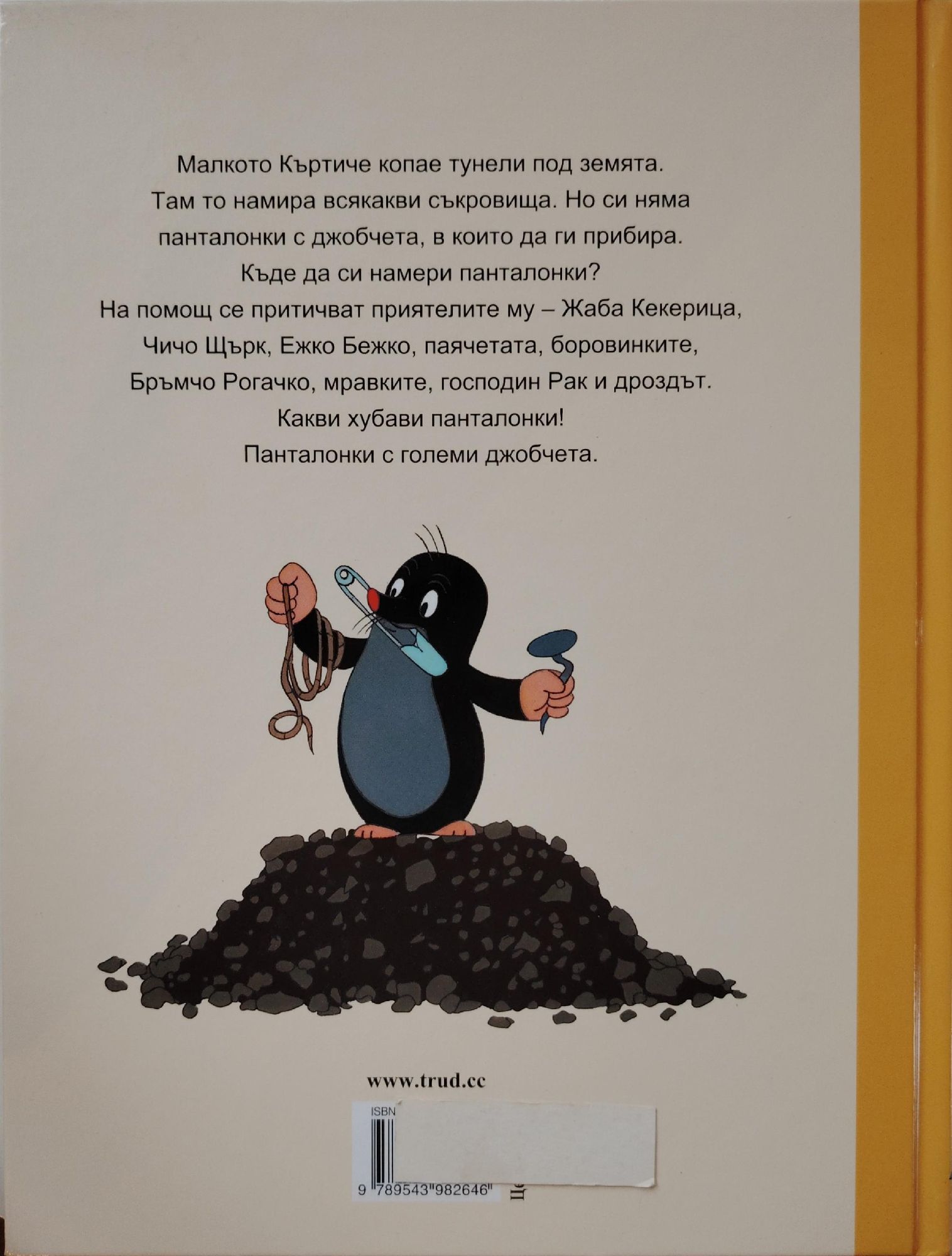 Малкото Къртиче копае тунели под земята. Там то намира всякакви съкровища. Но си няма панталонки с джобчета, в които да ги прибира. Къде да си намери панталонки? На помощ се притичват приятелите му - Жаба Кекерица, Чичо Щърк, Ежко Бежко, паячетата, боровинките, Бръмчо Рогачко, мравките, господин Рак и дроздът. Какви хубави панталонки! Панталонки с големи джобчета.